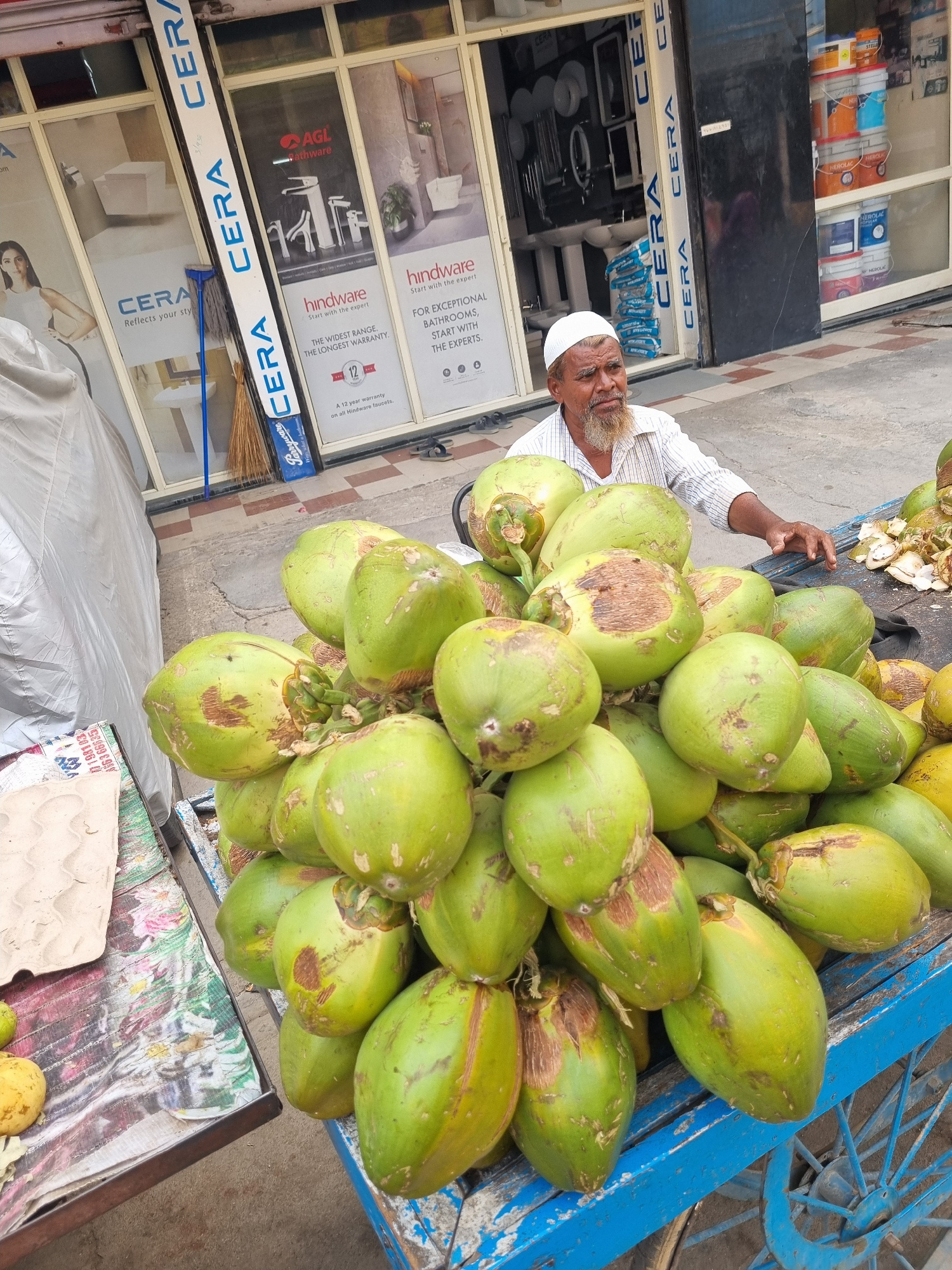 An adult male with a white beard and a white skullcap is seated next to a blue pushcart laden with green coconuts on a paved street in Puttaparthi, India. He wears a light-colored, striped shirt and h…read more