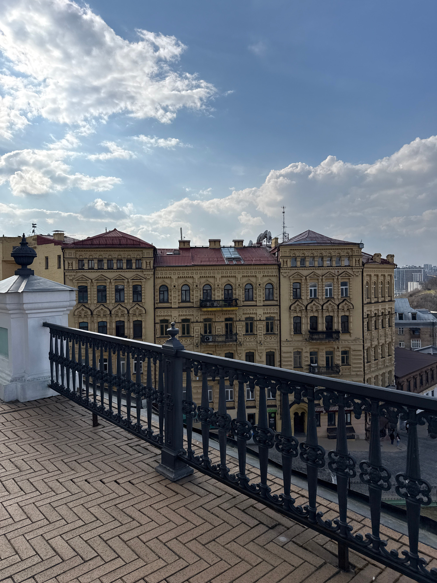 The image displays an elevated daytime view of a historic urban scene in Kyiv, Ukraine. In the foreground, a decorative black wrought-iron railing with ornate scrollwork and finials extends across theβ¦read more