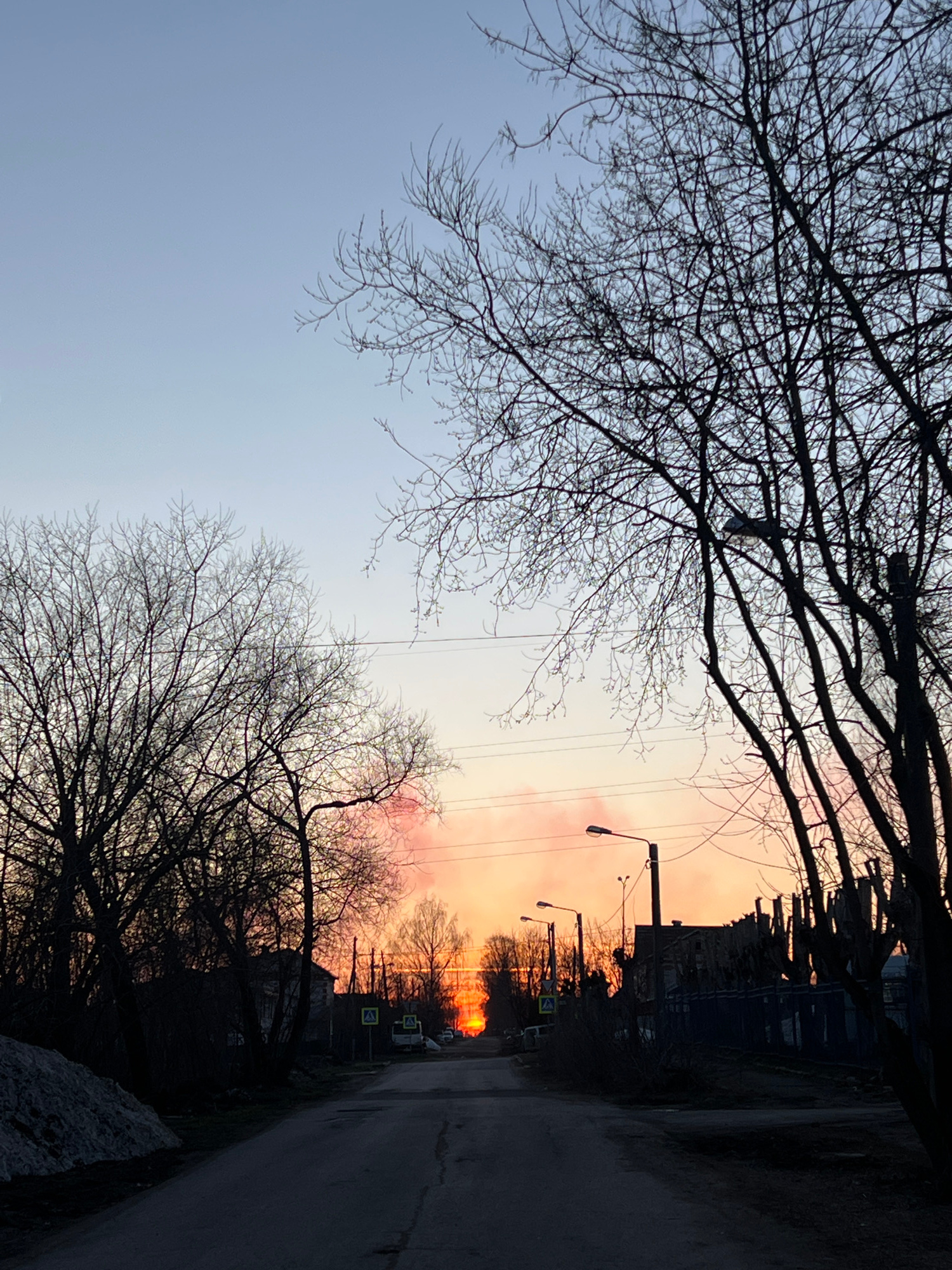 The image shows a sunset scene in what is likely a residential area of Berezniki, Russia. A road runs vertically on the right side of the frame. Bare trees dominate the foreground, silhouetted against…read more