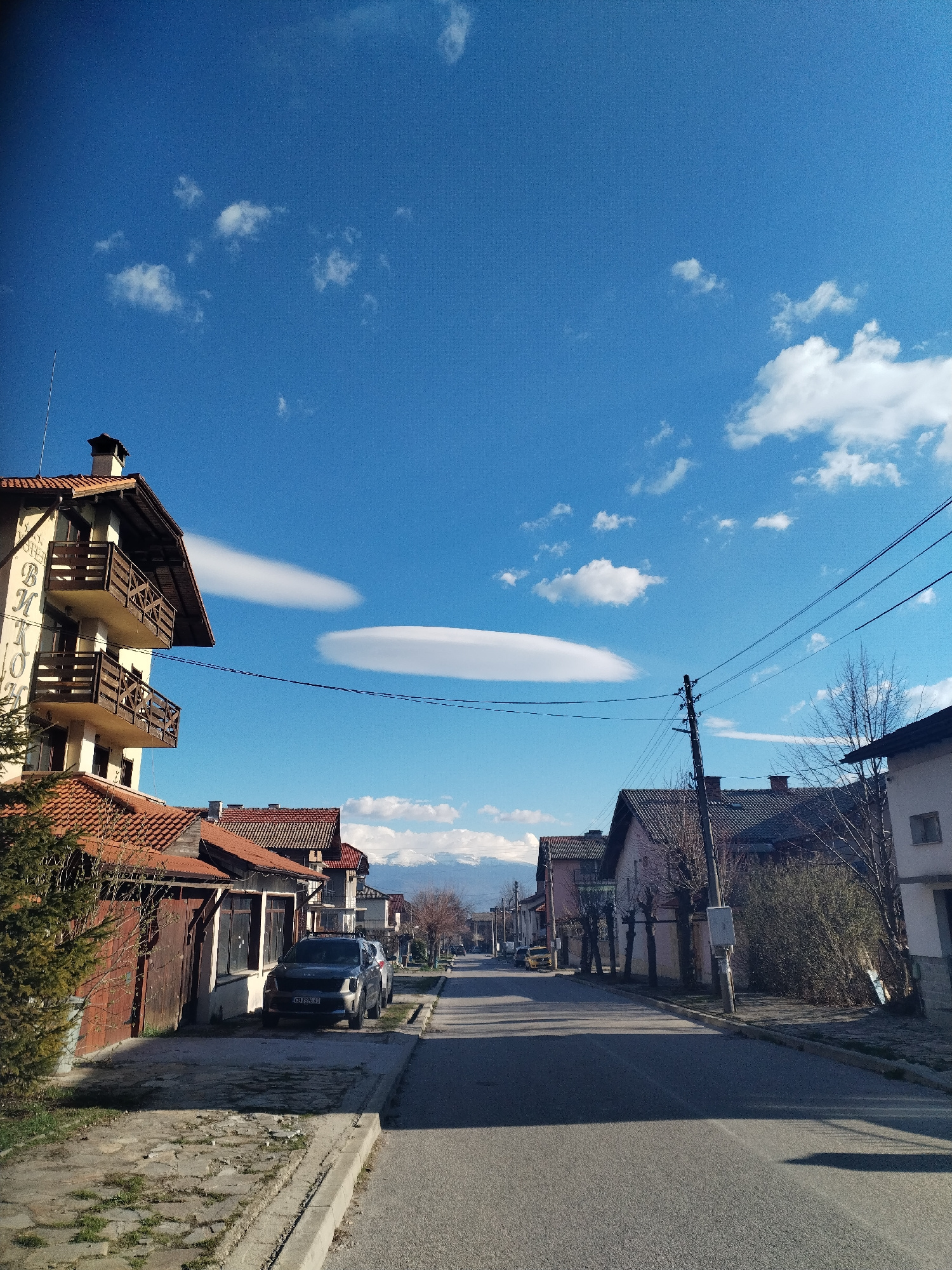 The image depicts a street view in the city of Bansko, Bulgaria, under a bright blue sky with scattered white clouds. A notable lenticular cloud is present above the street. The street, asphalt-paved,…read more
