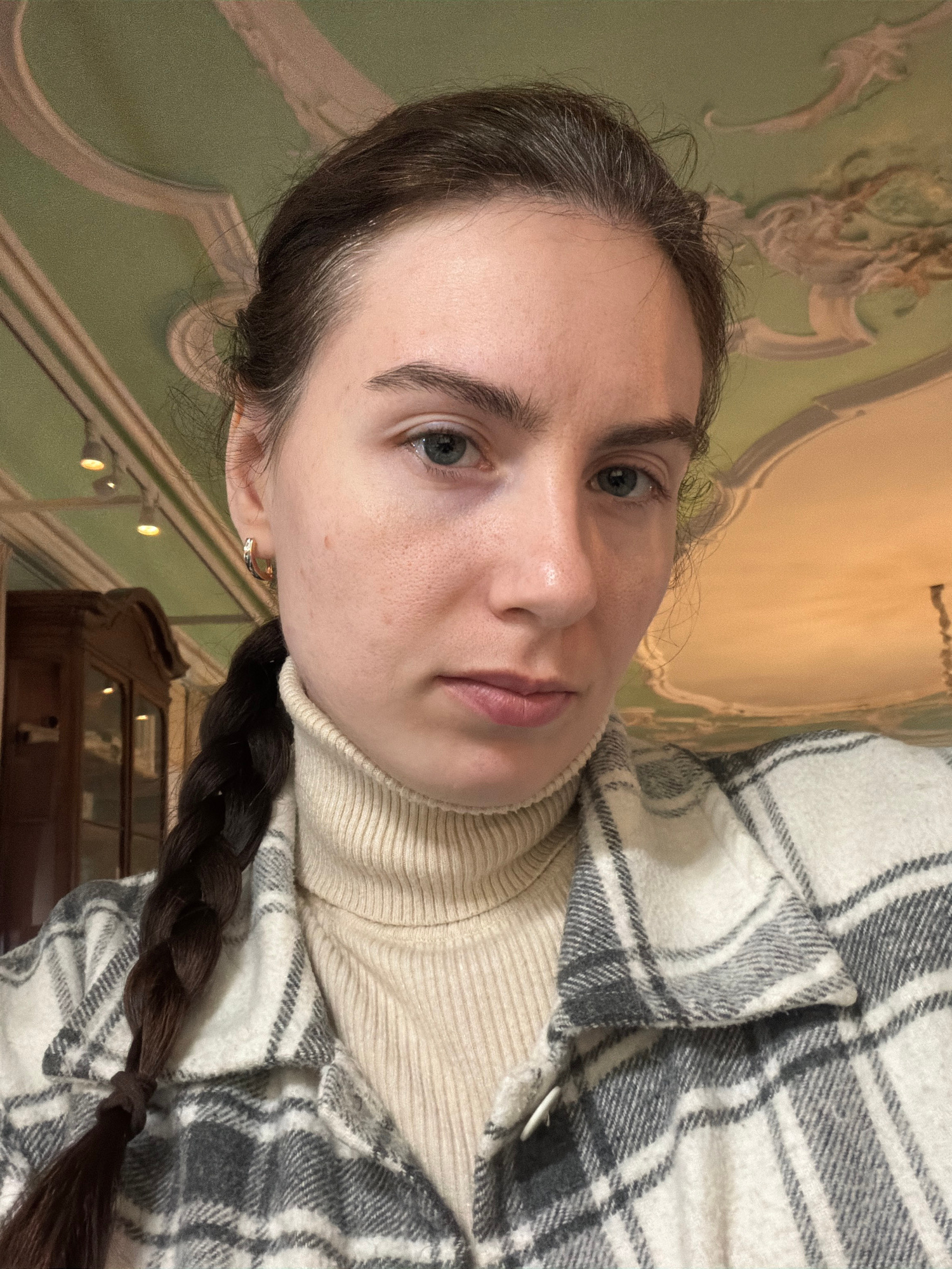 A woman with fair skin, light eyes, and dark brown braided hair is seen in a close-up, slightly angled shot. She wears a cream-colored turtleneck sweater and a grey and white plaid shirt or jacket. Sh…read more