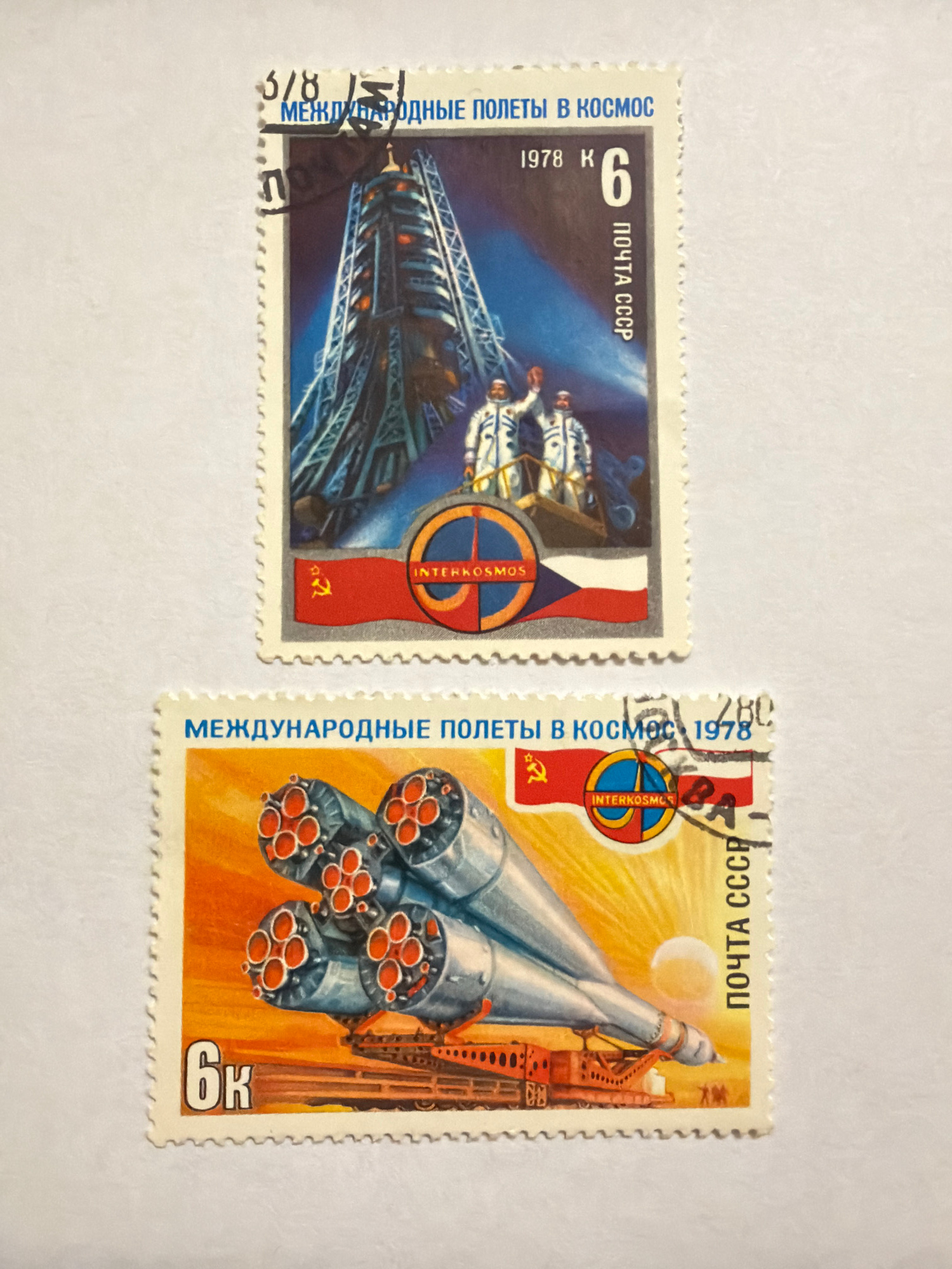 The image contains two Soviet Union postage stamps from 1978, commemorating the "International Flights in Space" program. Both are rectangular with serrated edges. The stamp on the left depicts a spac…read more