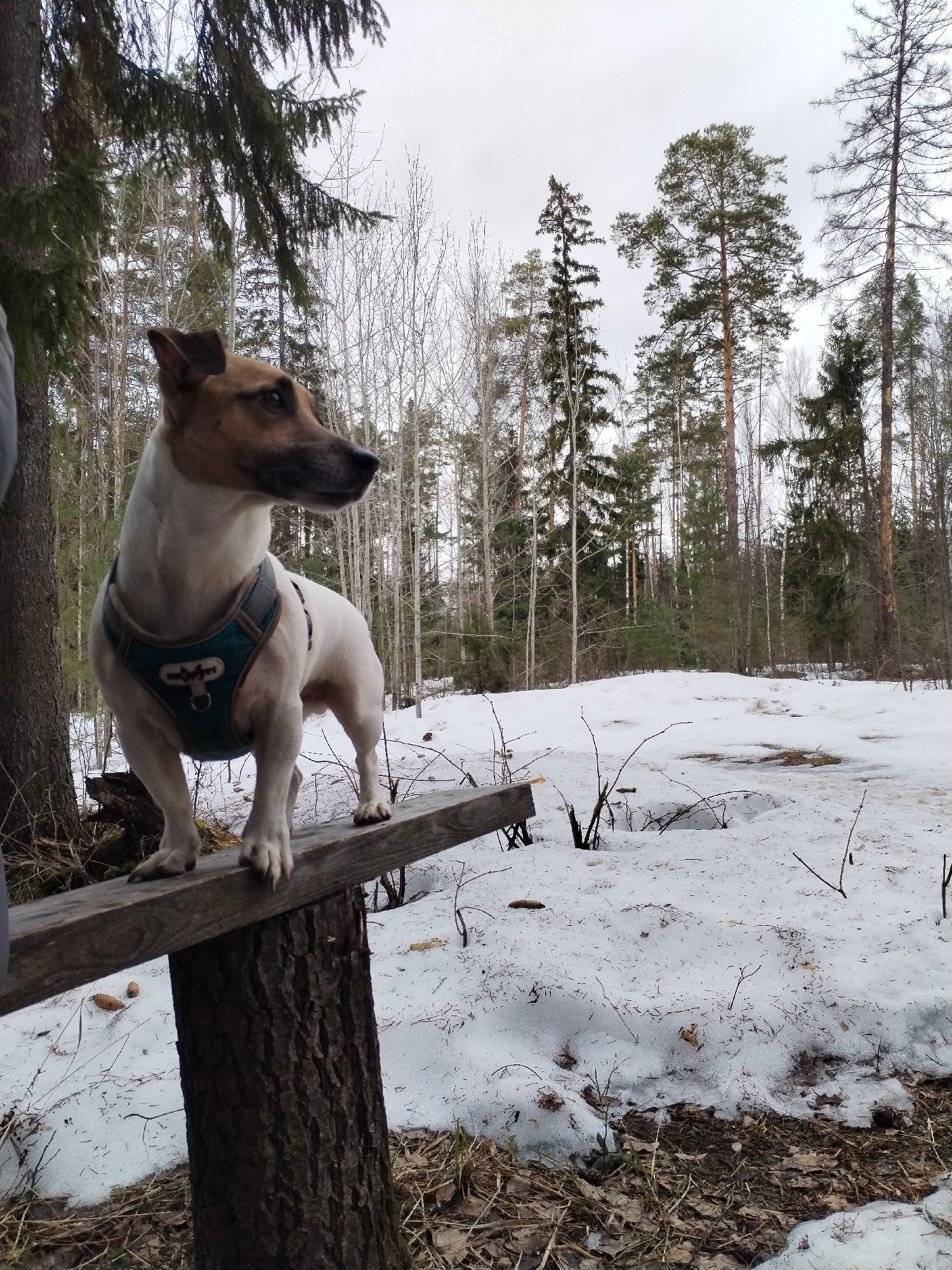 A medium-sized dog with short, tan and white fur, wearing a blue harness, stands on a weathered wooden plank supported by a tree stump in a snowy woodland setting. The dog is positioned facing left, a…read more