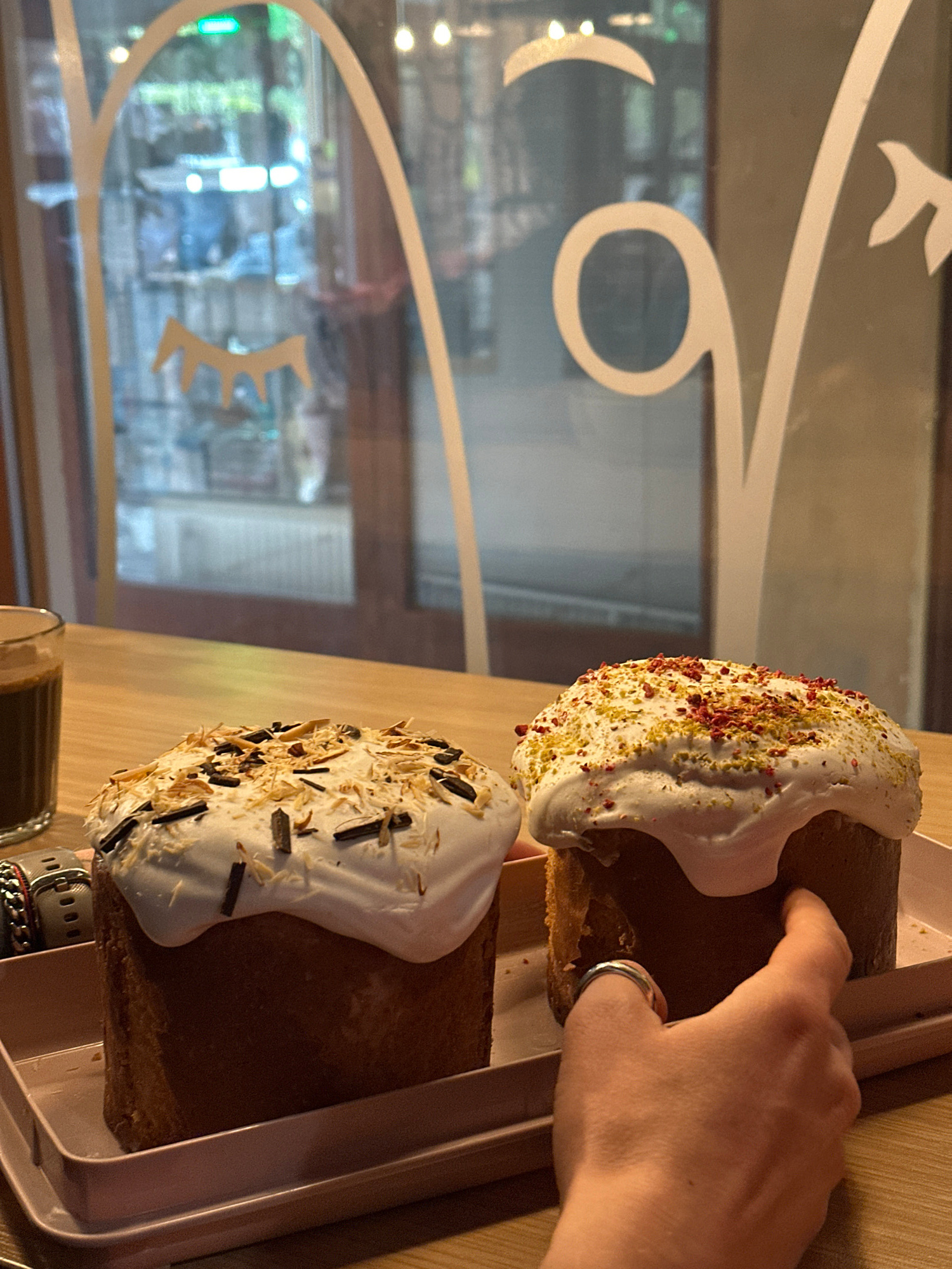 The photograph depicts a close-up view of two Easter cakes, also known as "kulich," placed on a pink tray. The cakes are decorated with white icing and various toppings, one featuring what appears to…read more