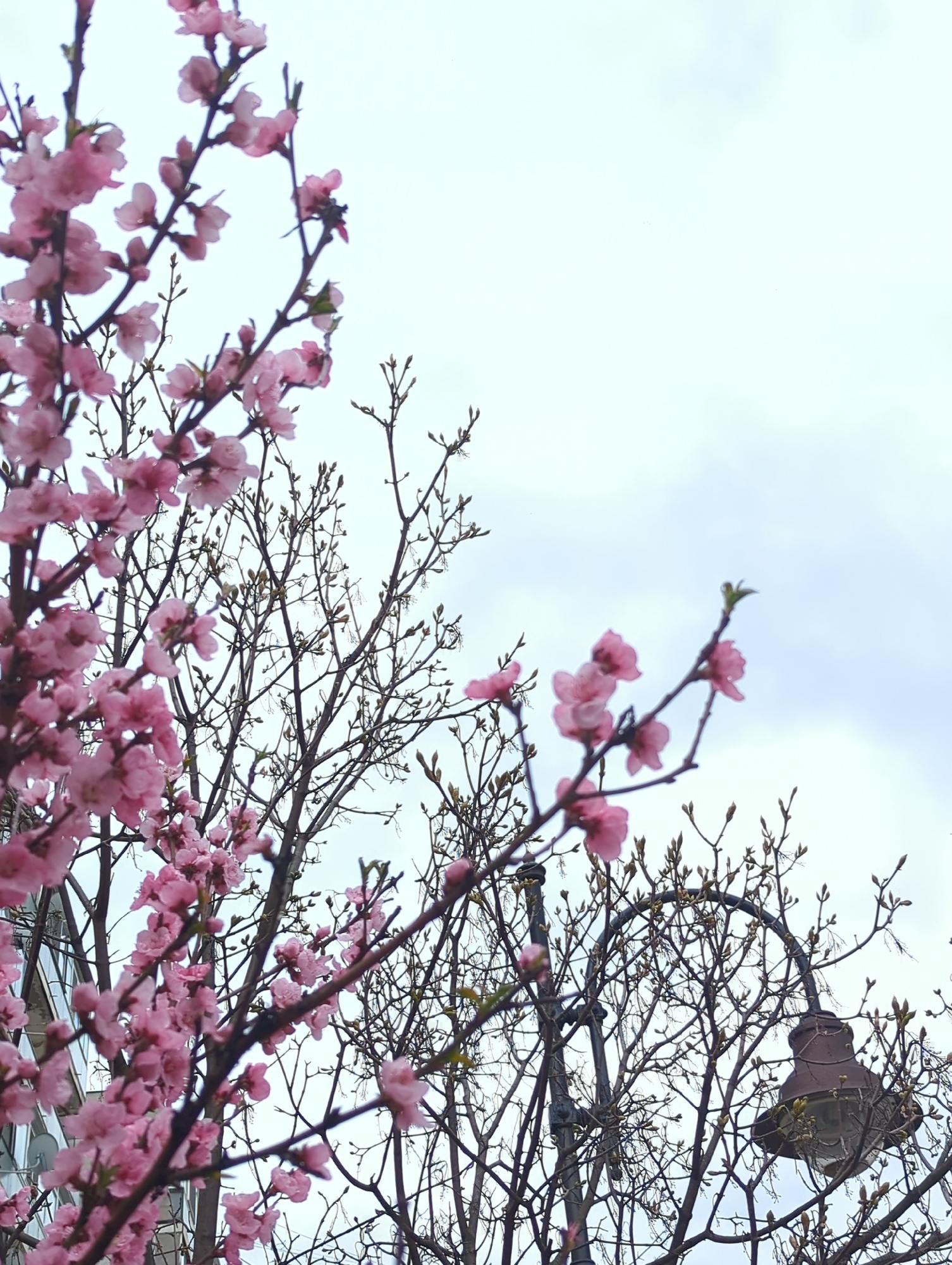 The image, likely taken in Razgrad, Bulgaria, presents a low-angle view of flowering branches against a pale sky with wispy clouds. The tree's branches are filled with small pink blossoms. Towards th…read more