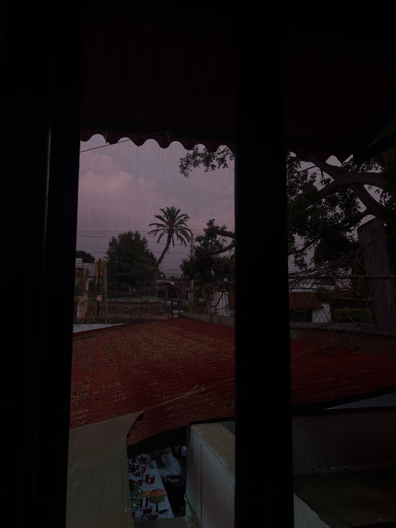 The image shows a view from a window, presumably in Oaxaca City, Mexico, as evidenced by the presence of a palm tree and the architectural style of surrounding buildings. The viewer is looking out at…read more