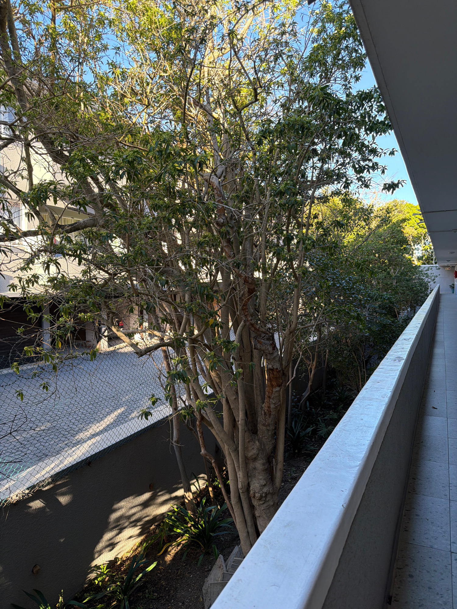 The image depicts a view from under a concrete structure, possibly a balcony or covered walkway, looking out at a large tree. The tree's trunk is thick and gnarled, with numerous branches extending ou…read more