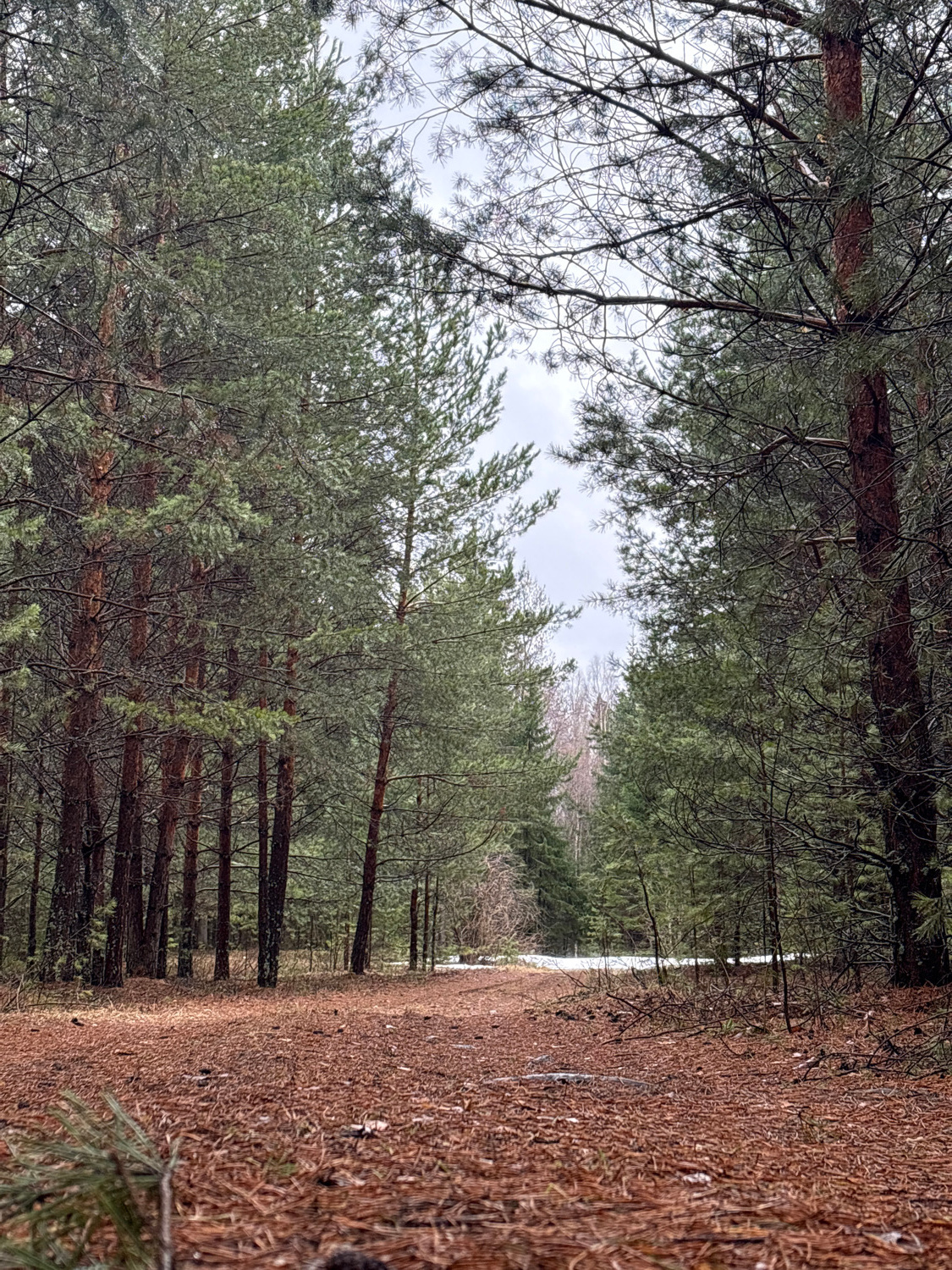 A vertical landscape photograph captures a quiet forest scene, likely in late winter or early spring, consistent with Chaikovsky, Russia. The image is dominated by tall pine trees and a ground covered…read more