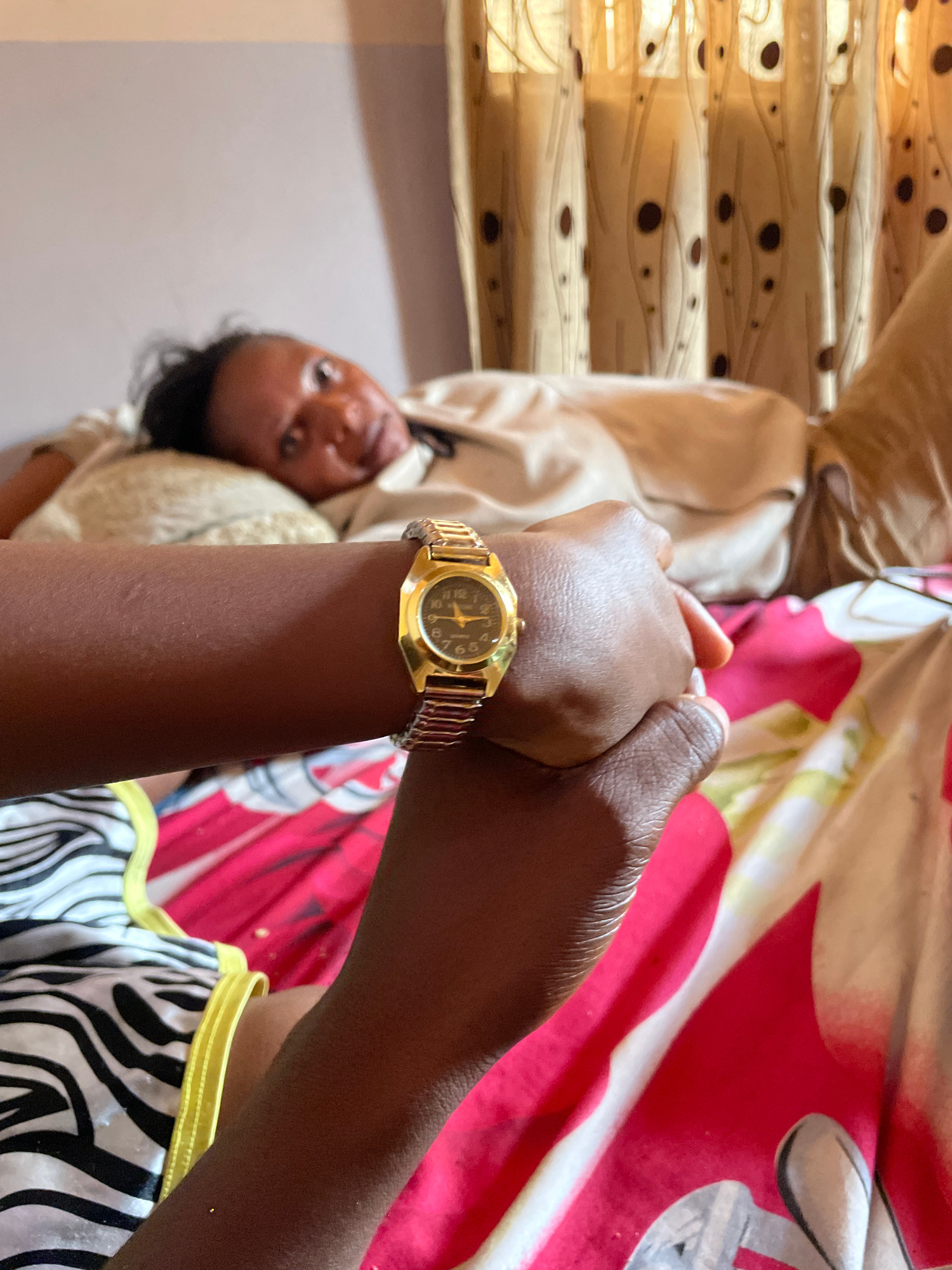A photograph taken indoors shows a person lying down, seen from an upside-down perspective, with a gold-colored wristwatch prominently displayed on their wrist. The person is wearing clothing with a zā¦read more