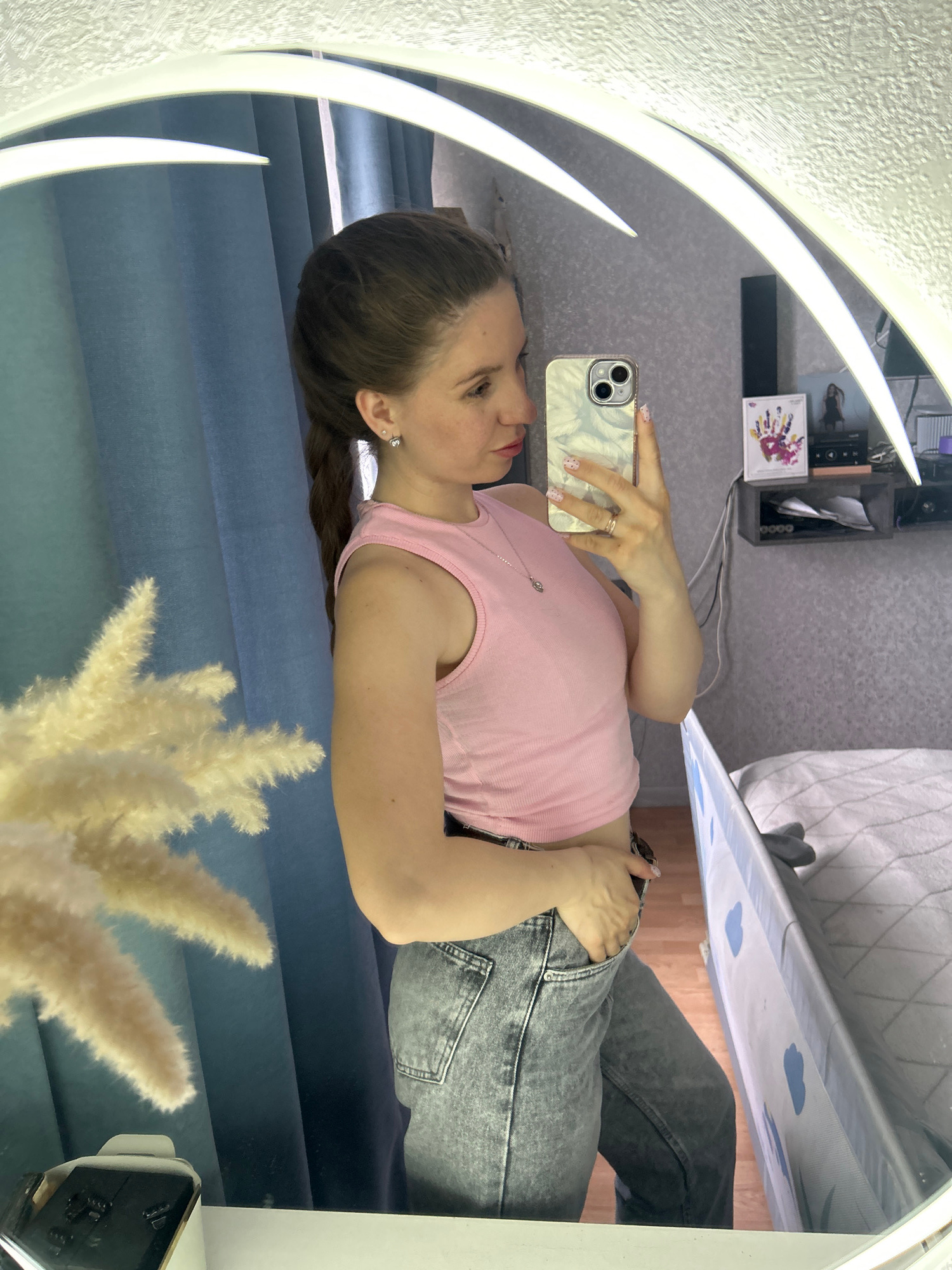A young woman is reflected in a round, illuminated mirror. She holds a smartphone in her right hand, taking a selfie. She wears a pink tank top and gray jeans. A white, feathery decoration is visible…read more