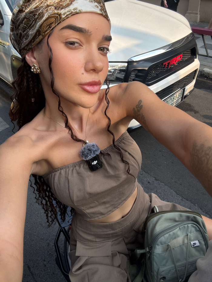 A female subject is depicted in a close-up, self-portrait photograph taken on a city street in Bangkok, Thailand. She has dark, curly hair, partially covered by a brown and beige paisley-patterned hea…read more