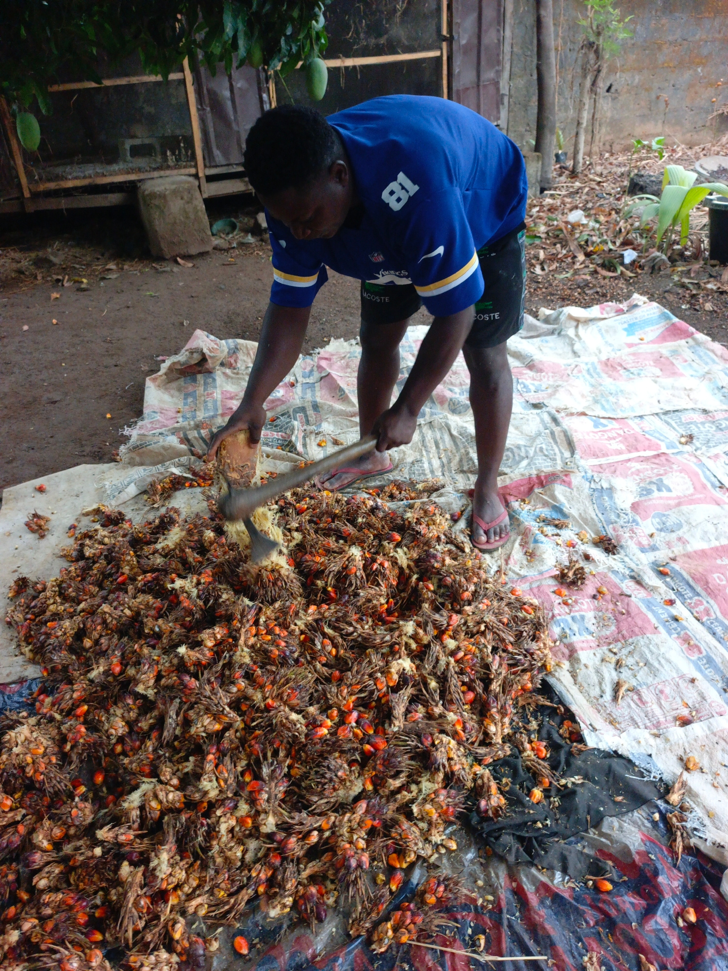 In Akwanga, Nigeria, a man stands on a large, patterned white tarp littered with palm fruit kernels and fibrous remnants. He is breaking apart the fruit with a blunt instrument, possibly a hammer or a…read more