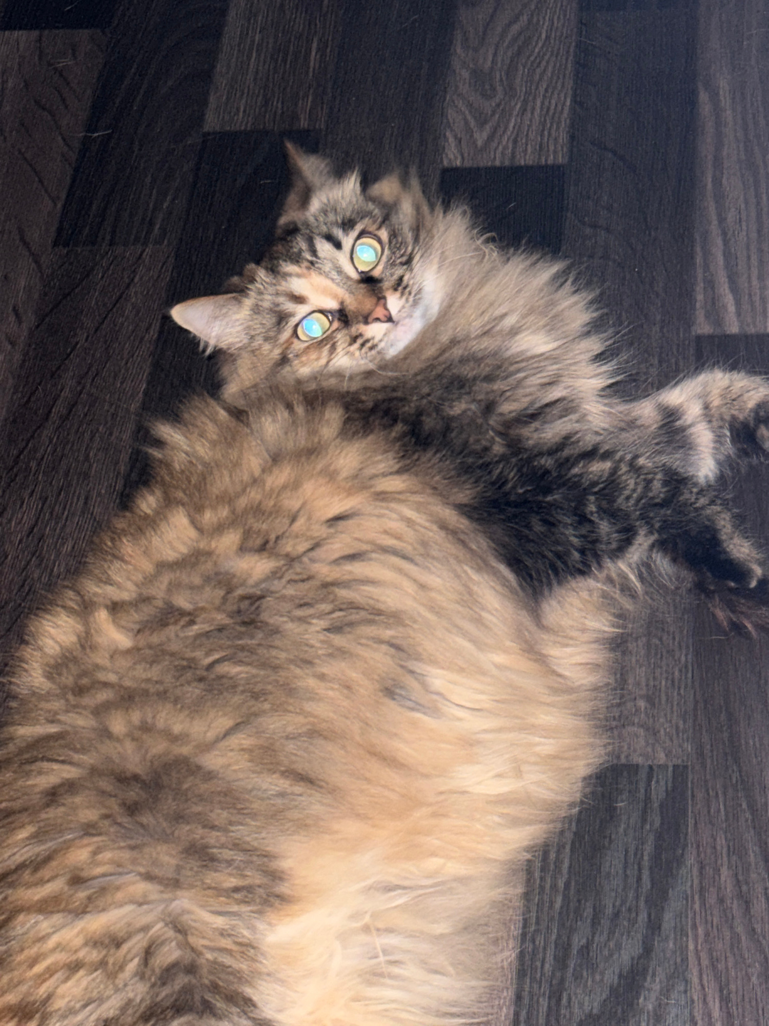 A long-haired tabby cat with golden eyes lies on its back on a dark brown wood-patterned floor. The cat's head is tilted, and its paws are extended upwards. The location is unknown.
