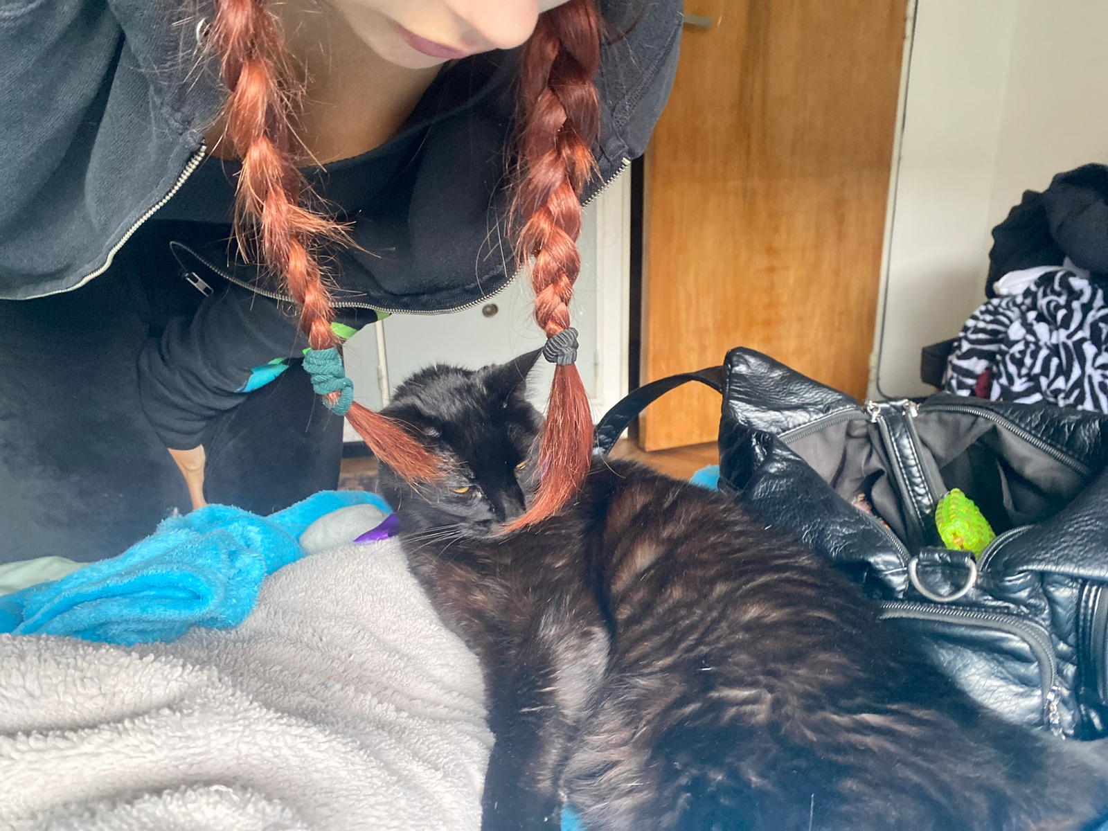 A black cat with red-brown braids poses in a chaotic indoor scene. The cat is partially obscured by a black leather bag on the left, a white and blue towel above, and a person with matching braids on…read more