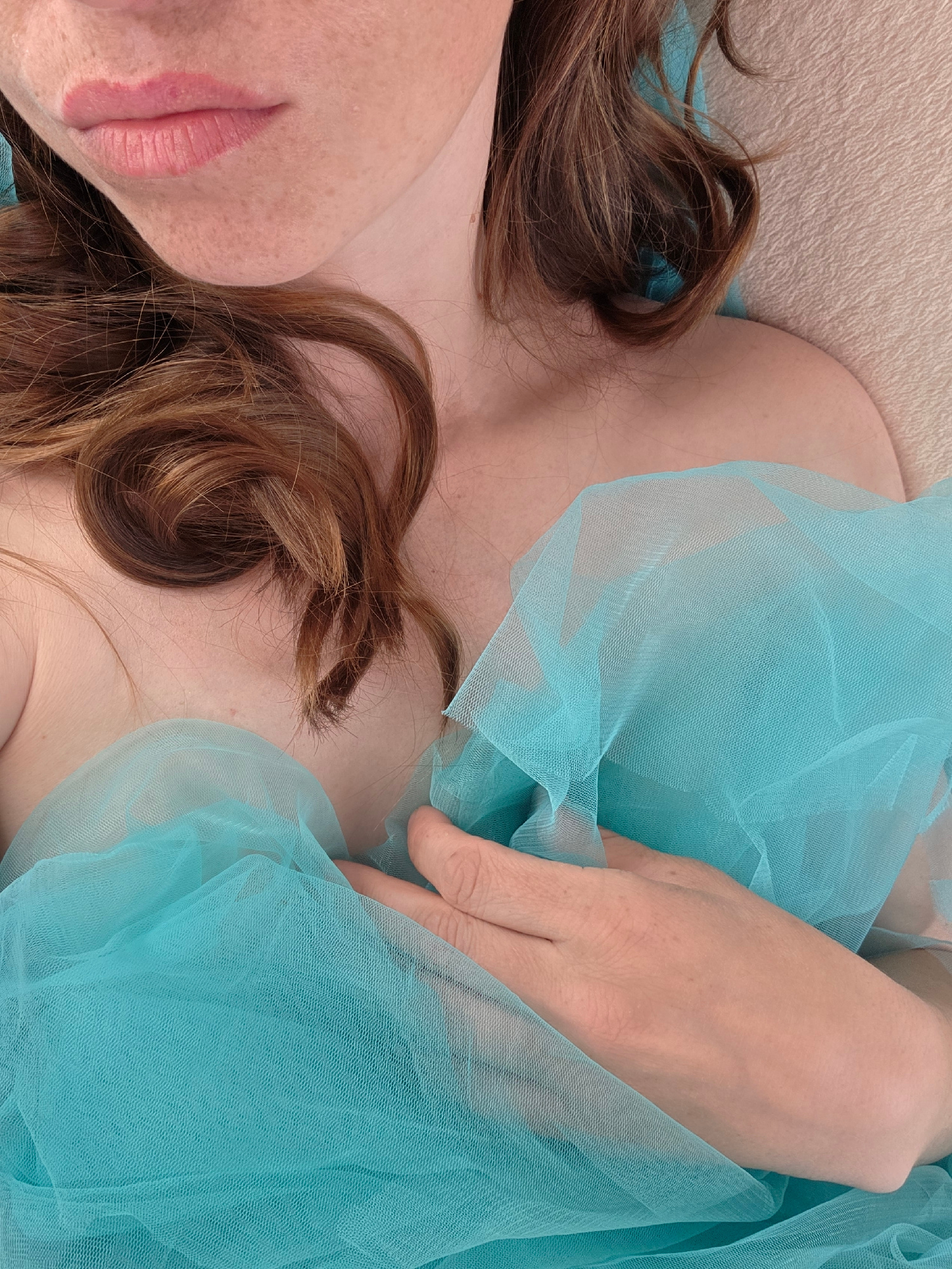 The image shows a person lying down, viewed from above, with a blue tulle fabric draped over their body. Only the person's face, chest, and one hand are visible. The person has light skin, reddish-bro…read more