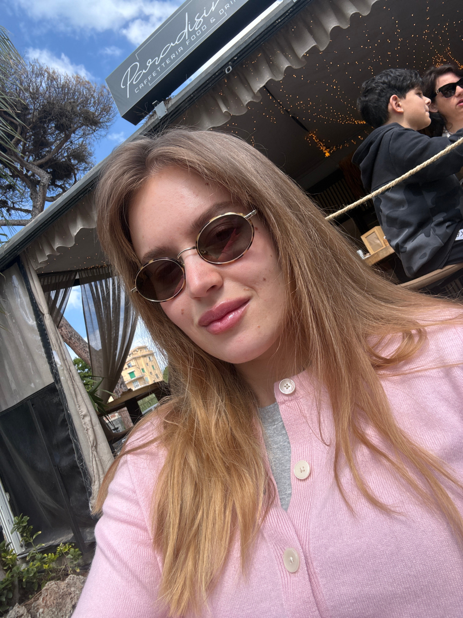 This angled outdoor selfie features a young woman with long, straight, light brown hair, wearing round brown-tinted sunglasses and a light pink button-up cardigan over a grey top. She has a subtle, re…read more