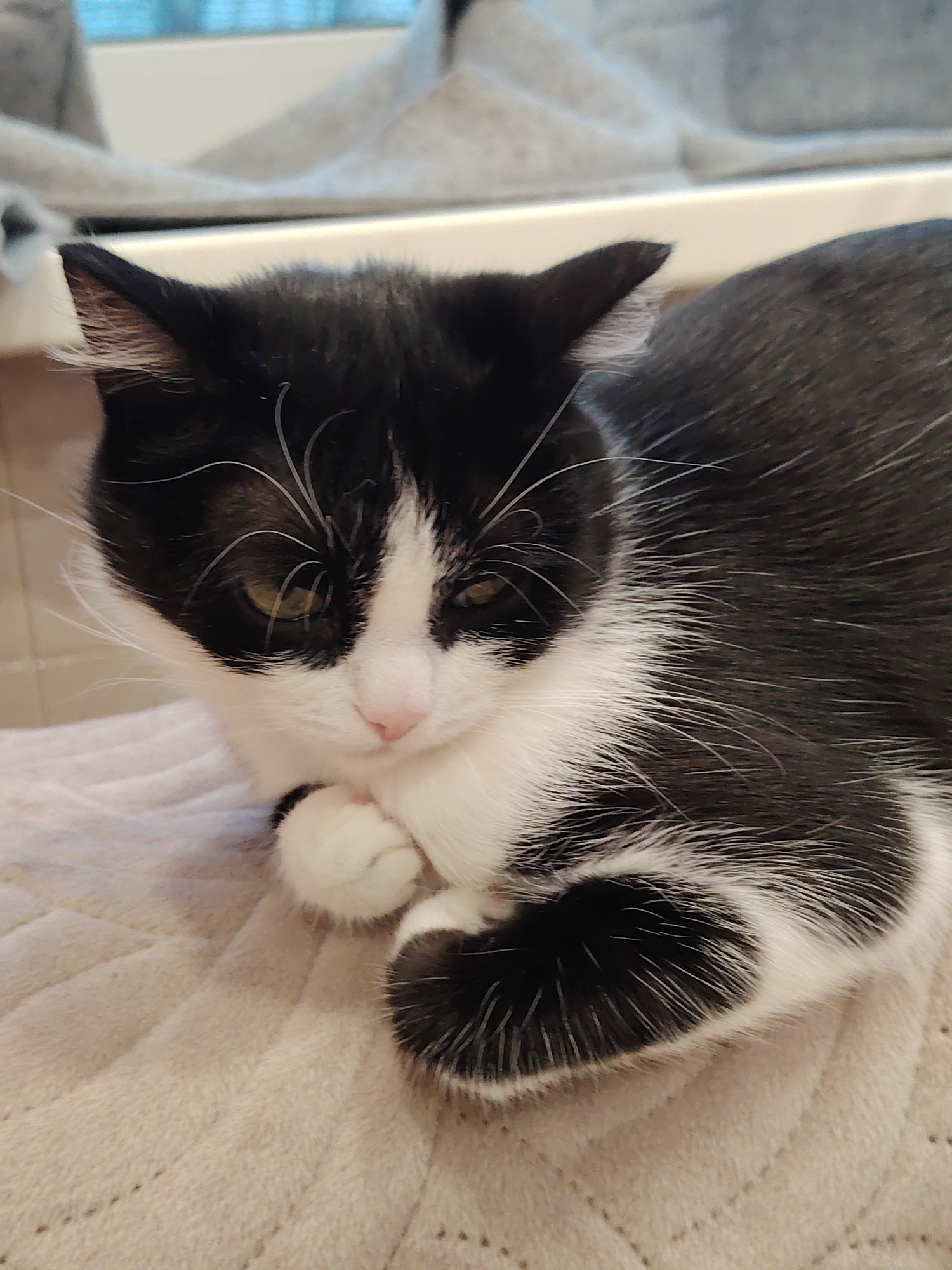 A black and white cat rests on a textured, light pink surface. The cat's face, primarily black with white patches, features a pink nose, green eyes, and long white whiskers. Its paws are tucked neatly…read more