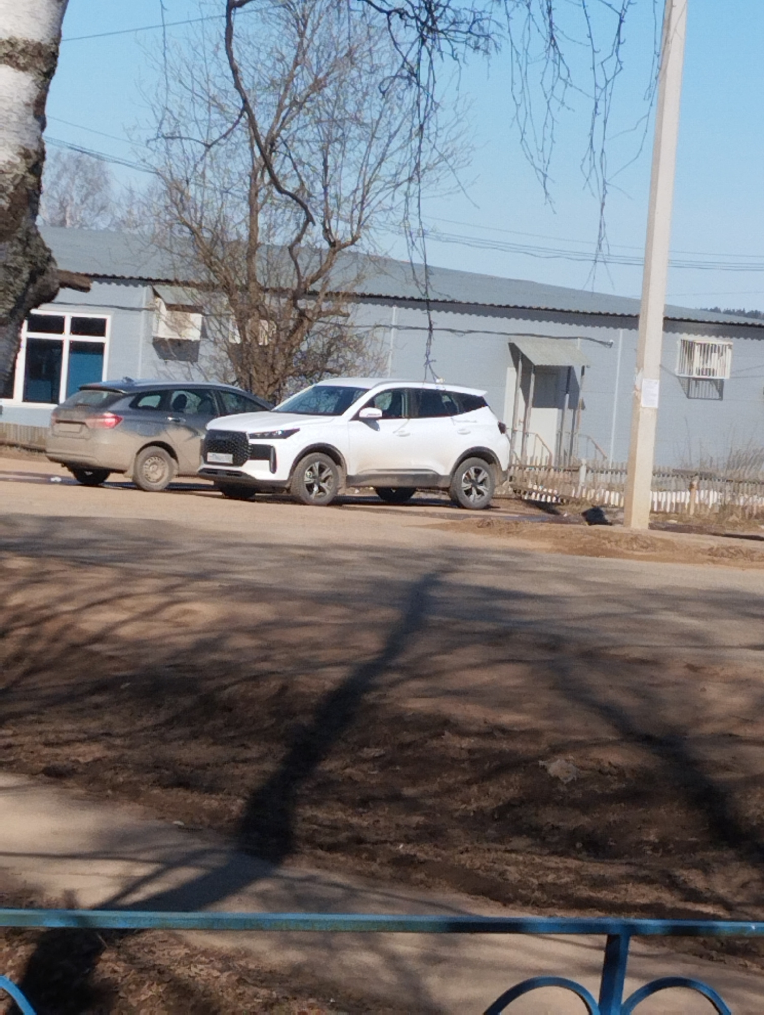 The image captures an outdoor scene under a clear, bright blue sky, indicative of a sunny day, likely in late winter or early spring given the bare trees and brown ground. Long shadows cast across the…read more