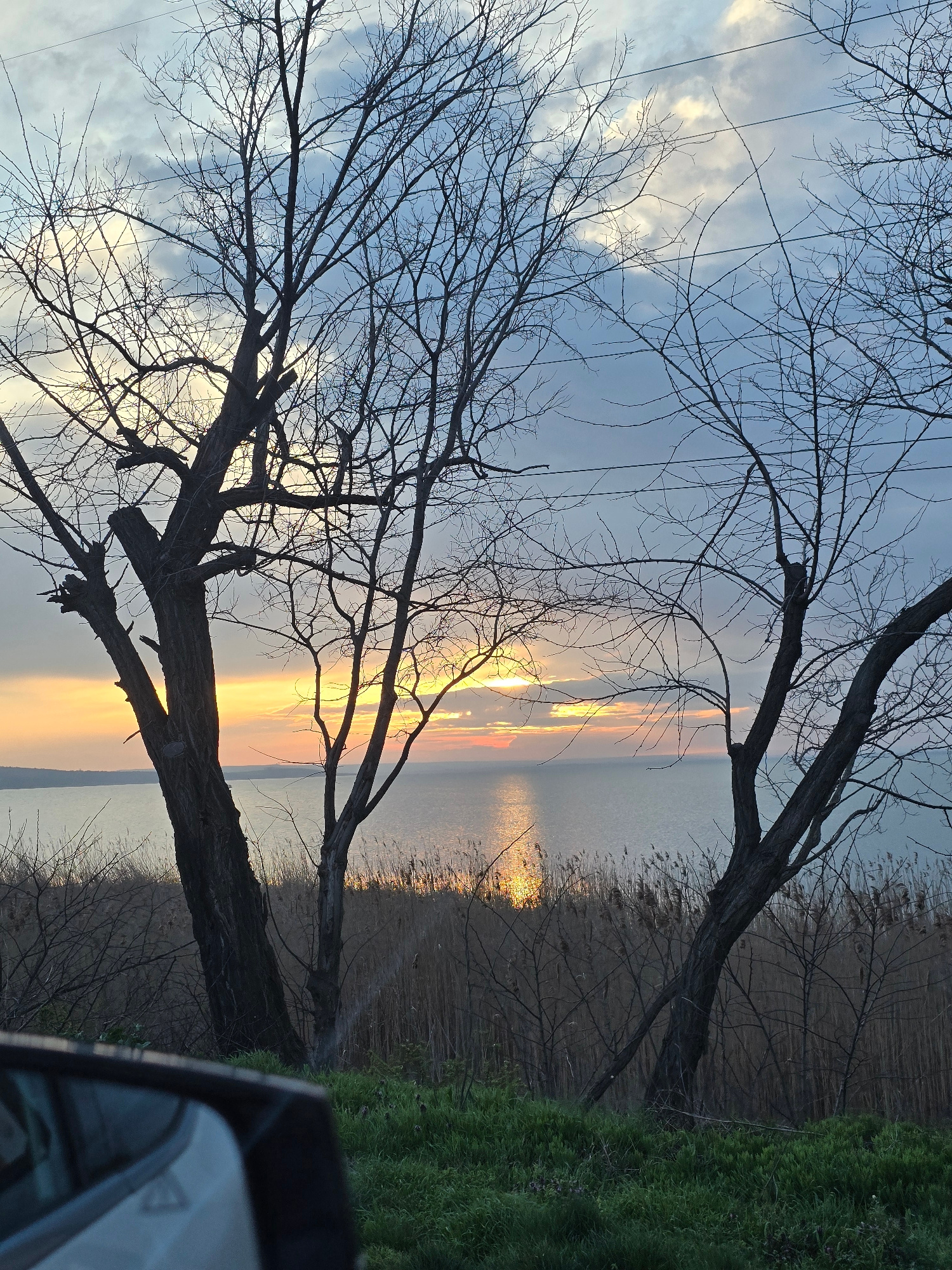 The photograph captures a sunset scene, likely near a body of water, given the reflections on the surface. Silhouetted trees are prominent in the foreground, their bare branches reaching into the sky.…read more