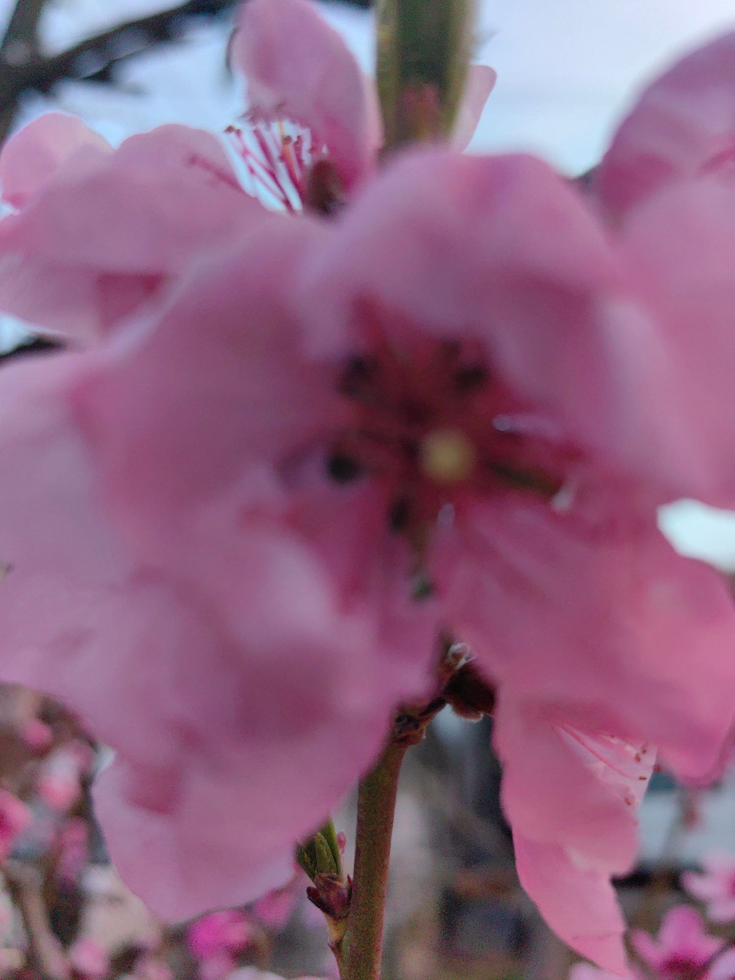 A blurry close-up photo shows pink blossoms on a branch. The background is out of focus but suggests other blossoms, possibly on trees. Location details are not discernible from the image itself, ther…read more
