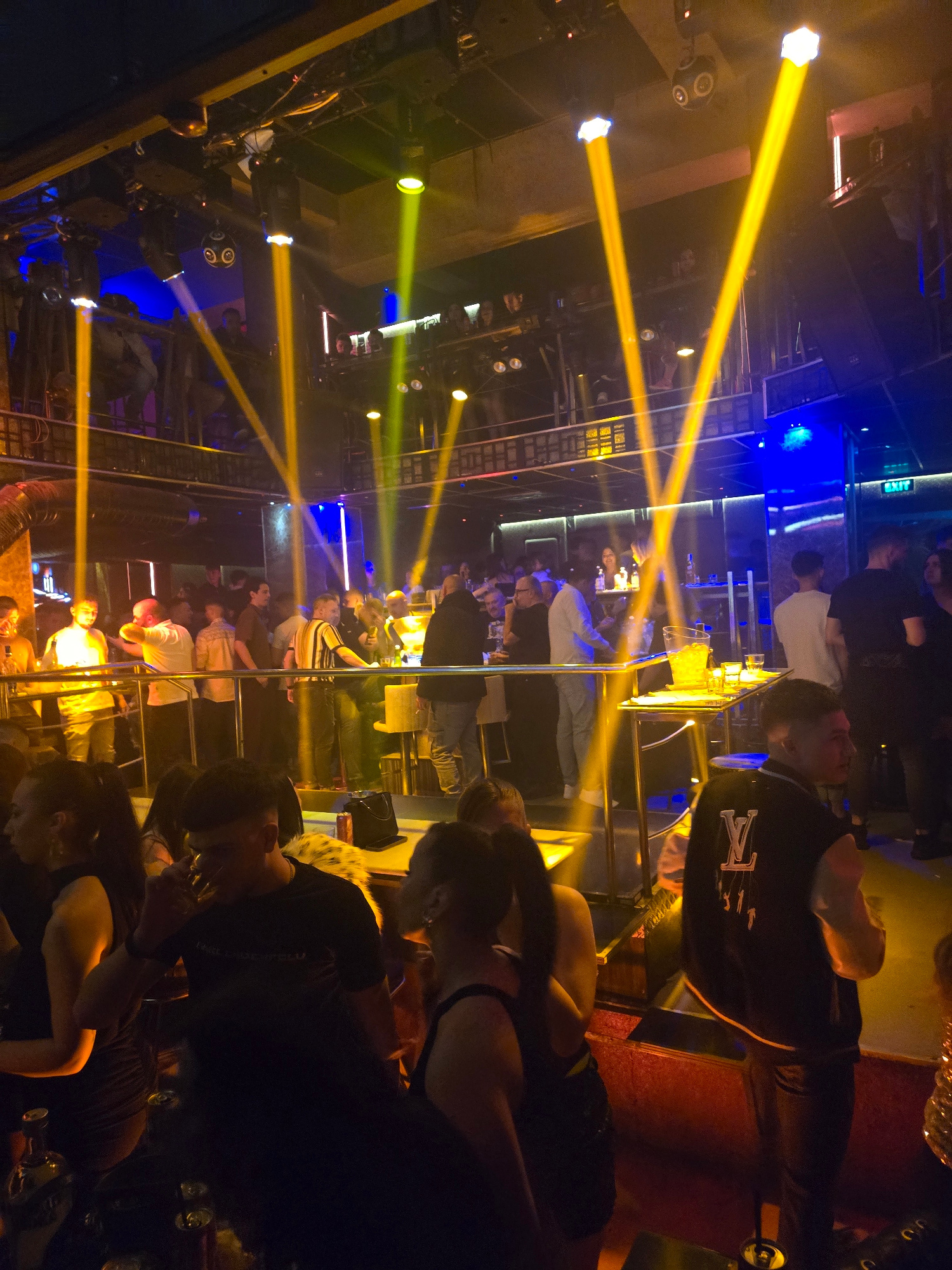 The image depicts a crowded nightclub interior in Smolyan, Bulgaria. There are numerous people, many standing and talking, and some seated at tables. The lighting is dynamic, with a mix of yellow and…read more