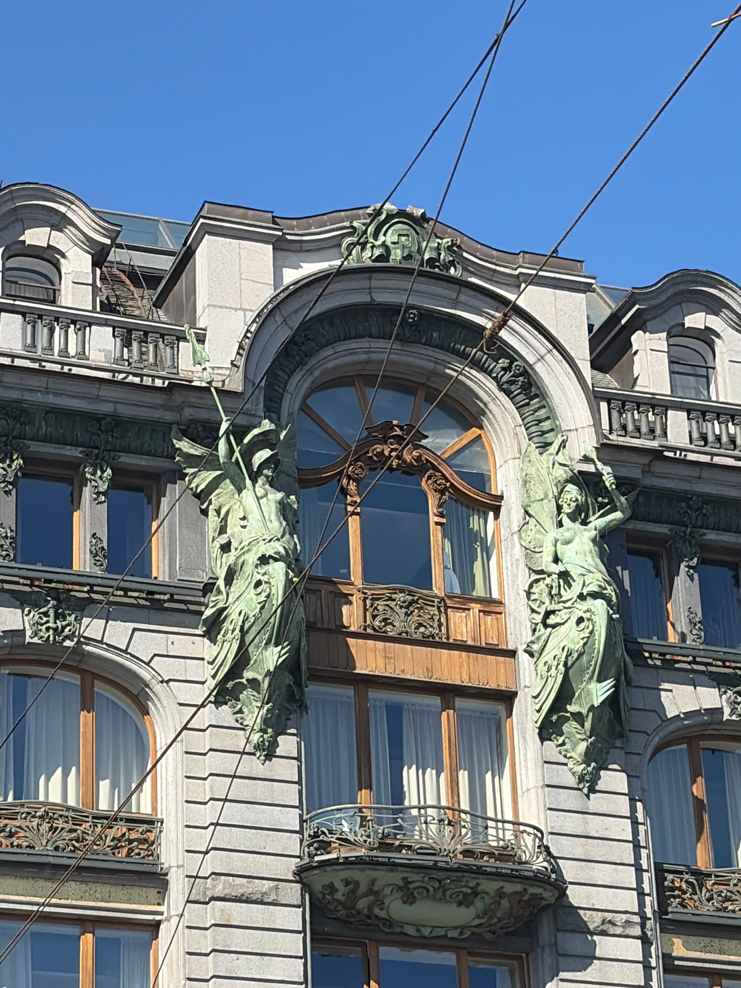 This image presents an upward-looking view of a highly ornate architectural facade, characteristic of historical European cities like Saint Petersburg, Russia, under a clear, bright blue sky. The buil…read more