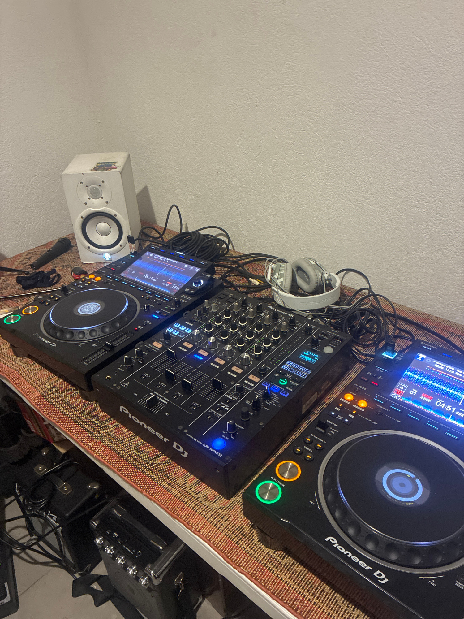 Here is a detailed description of the image: **Scene Overview:** The image shows a DJ setup, likely in a home or small studio setting. It's oriented at an angle, making it appear as if the equipment is placed on a diagonal surface. The backdrop consists of a plain, light-colored wall. **Equipment and Objects:** * **DJ Turntables:** There are two Pioneer DJ turntables, models likely from the CDJ series, based on the design and layout. They feature digital displays showing track information, waveforms, and looping controls. * **DJ Mixer:** Positioned between the turntables is a Pioneer DJ mixer, possibly a DJM-900NXS2, given the control layout and labeling. This mixer controls audio levels and transitions between the turntables. * **Headphones:** A pair of light-colored headphones sits near the mixer, presumably used for monitoring and cueing tracks. * **Studio Monitor:** A single white studio monitor is visible on the lower-left of the frame, likely used for monitoring sound output. * **Cables:** A tangle of black cables connects the various pieces of equipment. **Location:** The location is not specifically identifiable from the image. **Environment:** The setup is on a surface covered by what looks like a woven or patterned rug. Underneath the table appears to be an audio system. **Overall Impression:** The image captures a functional DJ setup, suggesting someone is either practicing, recording, or performing. | Open Wire
