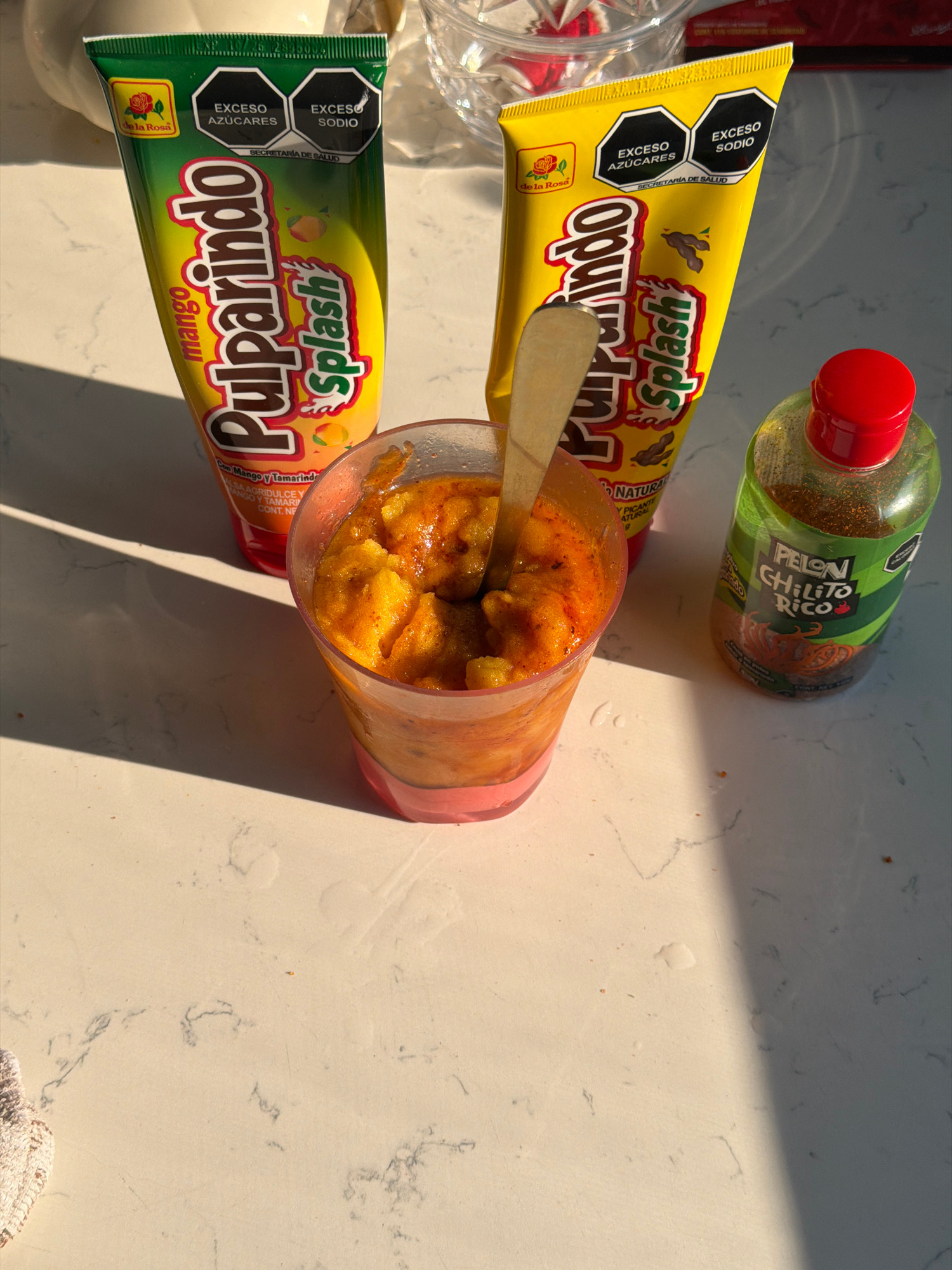 The image presents a top-down view of a snack arrangement on a light-colored countertop with subtle gray marbling, likely indoors. Predominantly, the composition includes two tubes of "Pulparindo Spla…read more