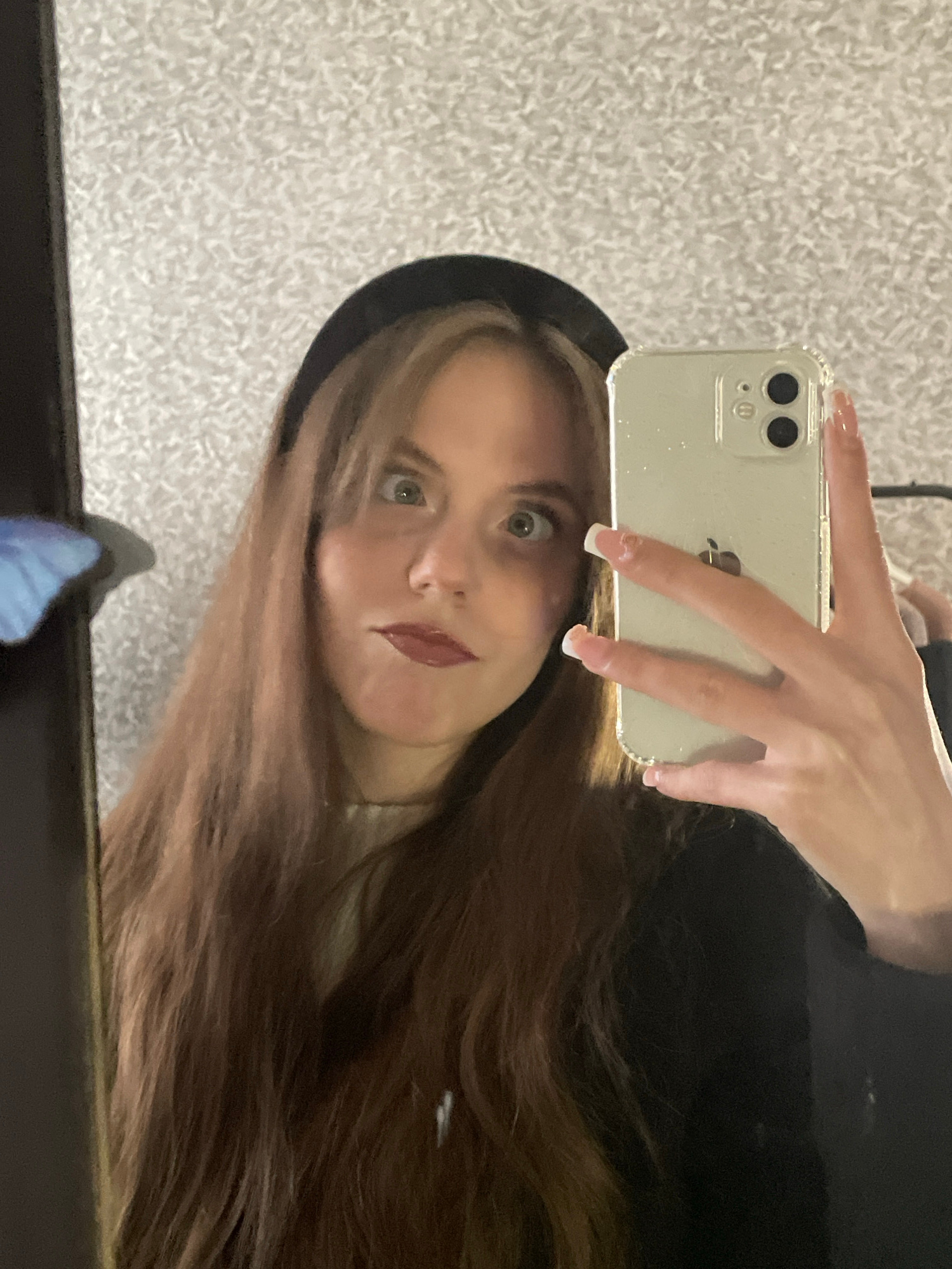 A young woman with long brown hair and a black headband takes a selfie with an iPhone. She is holding the phone in her left hand, positioned above her head. Her nails are painted with white tips. She…read more