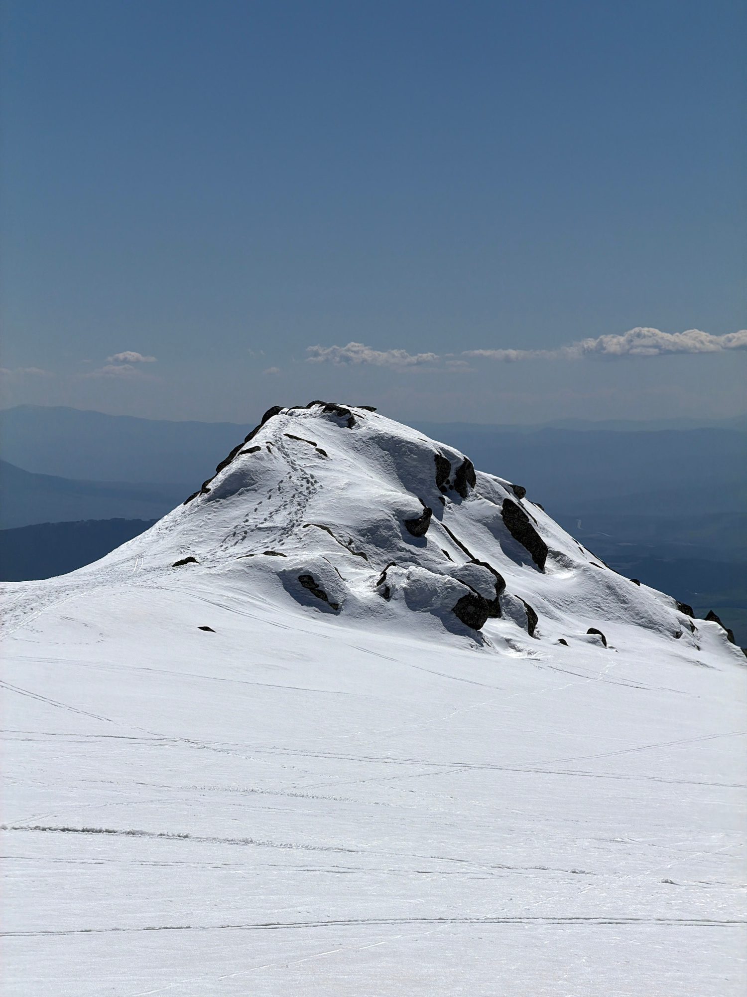 The image shows a snow-covered mountain peak. The sky is clear blue with some faint clouds on the left side. The mountain face is mostly white snow, with some rocky outcrops visible. There are ski tra…read more