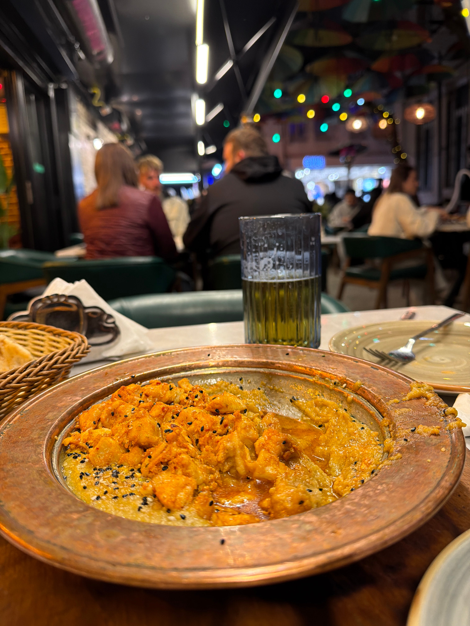 The image presents a close-up view of a dining table inside a restaurant, captured under artificial lighting, suggesting an evening setting. The primary focus is a large, round copper platter filled w…read more