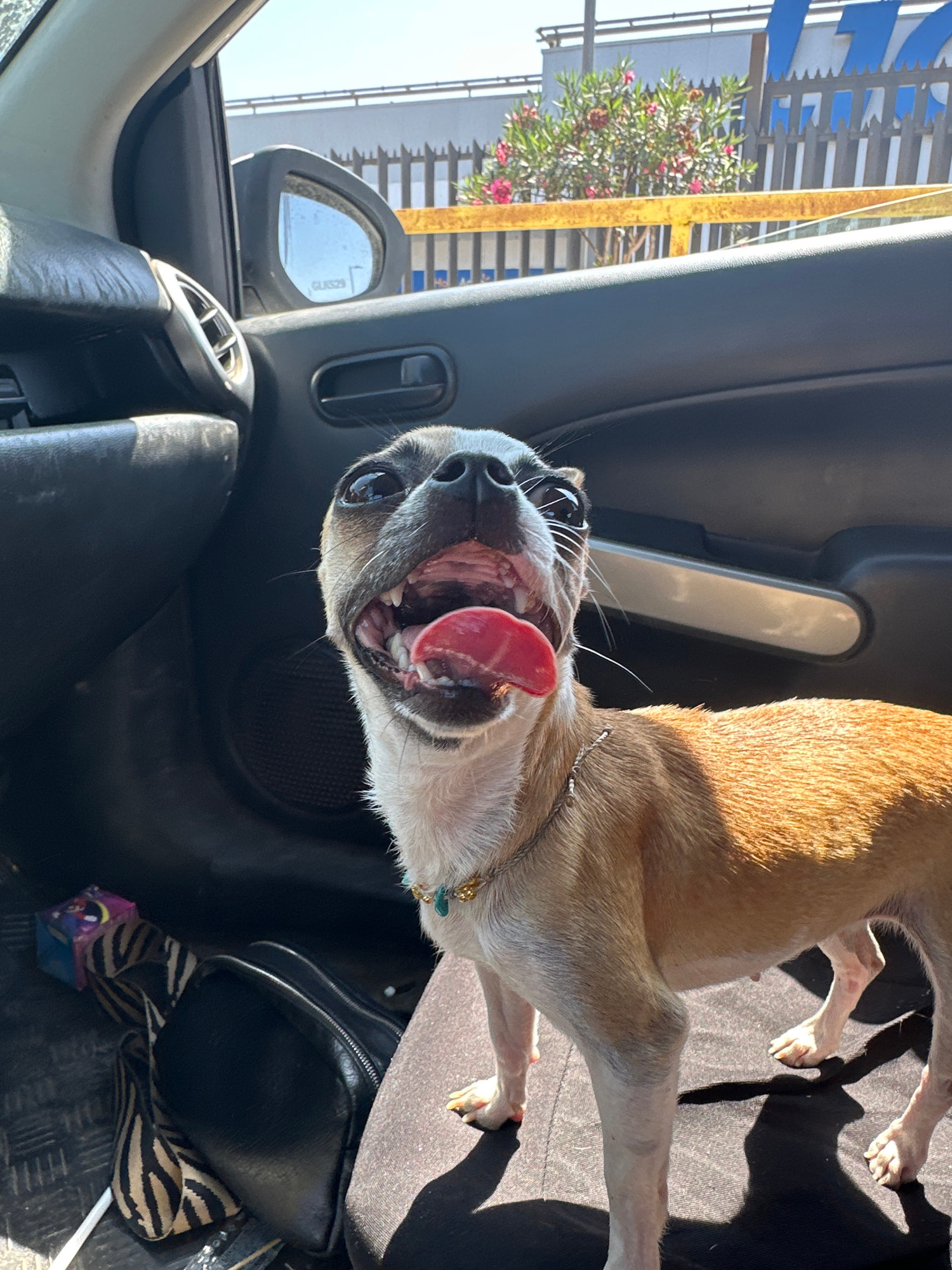 A close-up, interior shot depicts a tan and white Chihuahua-type dog, tongue lolling out, seemingly inside a car. The dog is positioned near the car door and dashboard area. In the background, a car sā¦read more