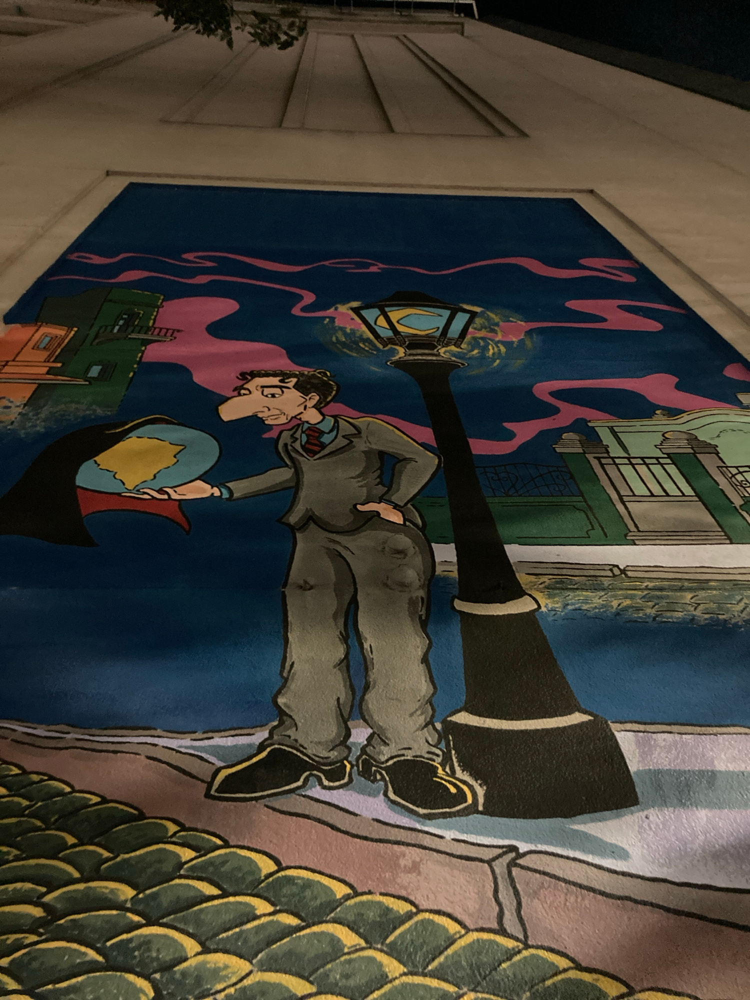 The image displays a vibrant mural painted on an exterior wall, viewed at what appears to be night, indicated by the dark surroundings outside the mural and the lit lamppost within the artwork. The mu…read more
