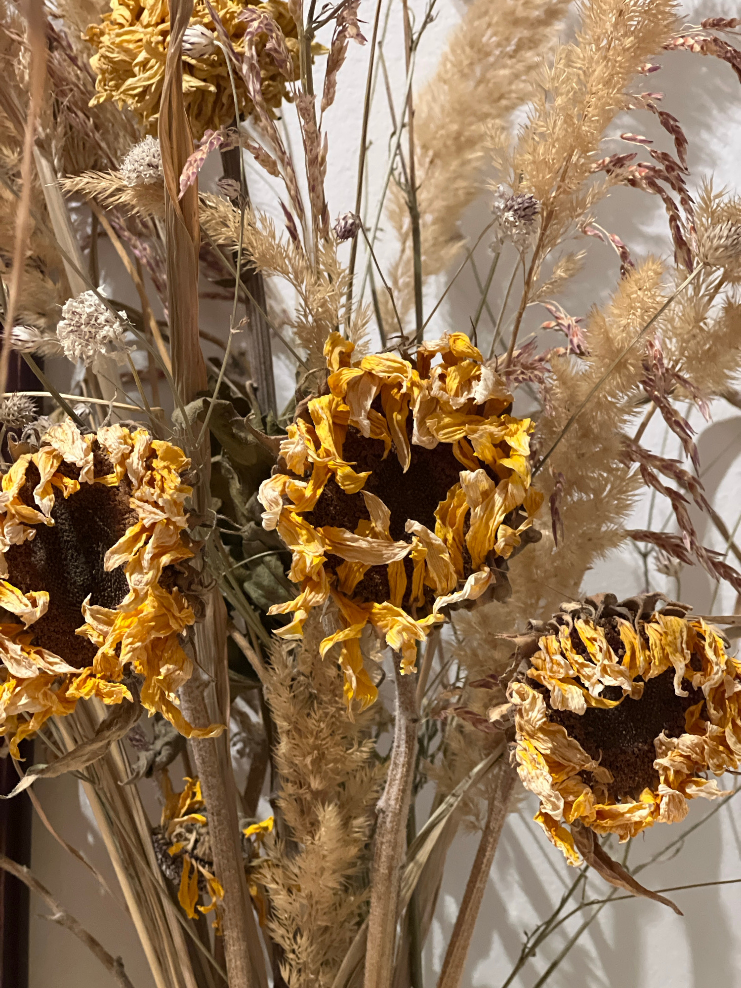 The image shows a close-up of dried flowers and foliage, including sunflowers with withered yellow petals and brown centers, and various types of grasses and reeds in beige and brown tones. The arrang…read more