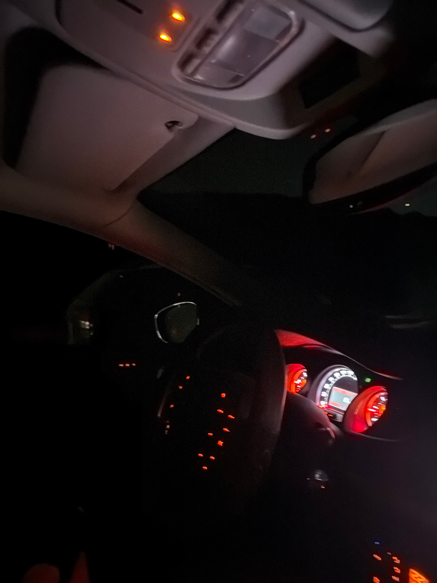 The image shows the interior of a car at night. The dashboard, steering wheel, and part of the car's ceiling are visible. The car's instrument panel is lit up, showing the speedometer and other gauges…read more