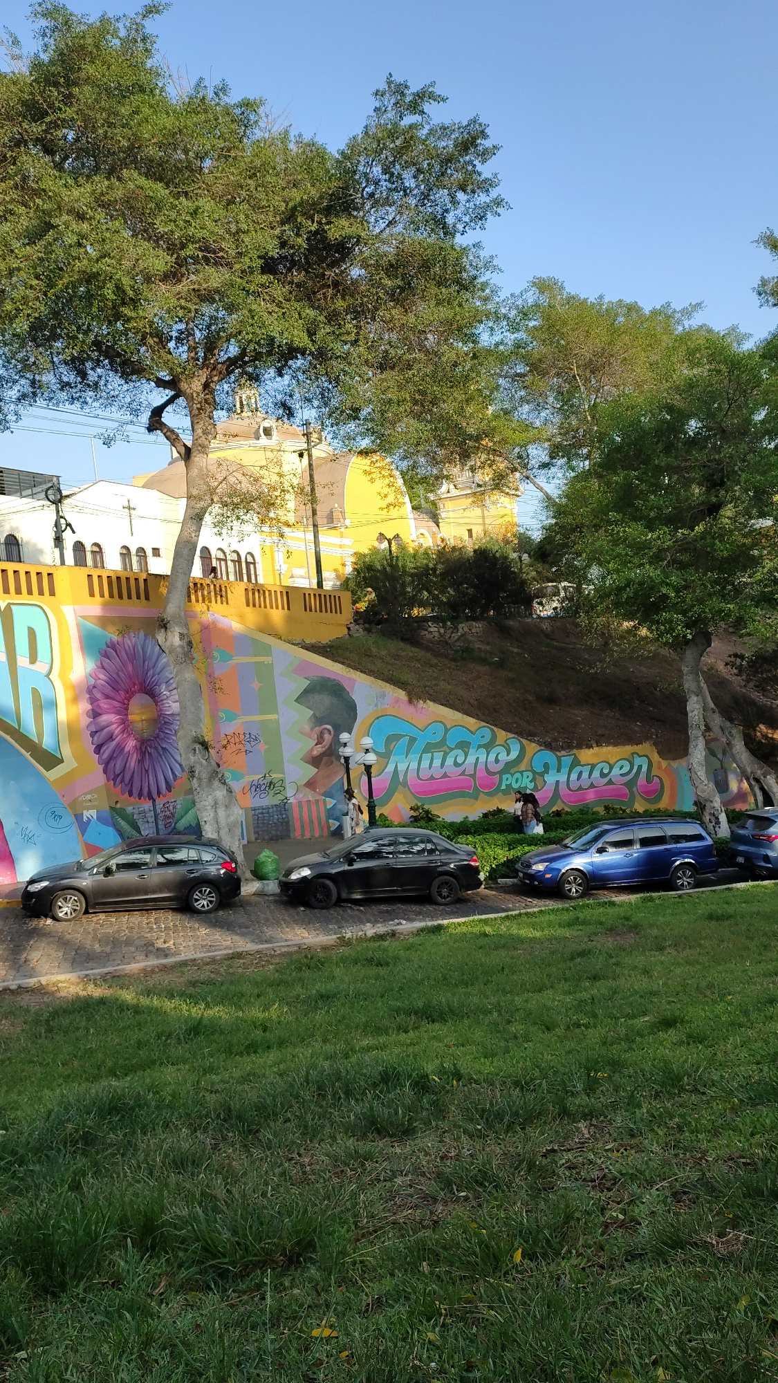 The image captures a street scene in Barranco, Peru, with a colorful mural as a prominent feature. The mural adorns a retaining wall and incorporates a vibrant palette of yellows, purples, blues, and…read more