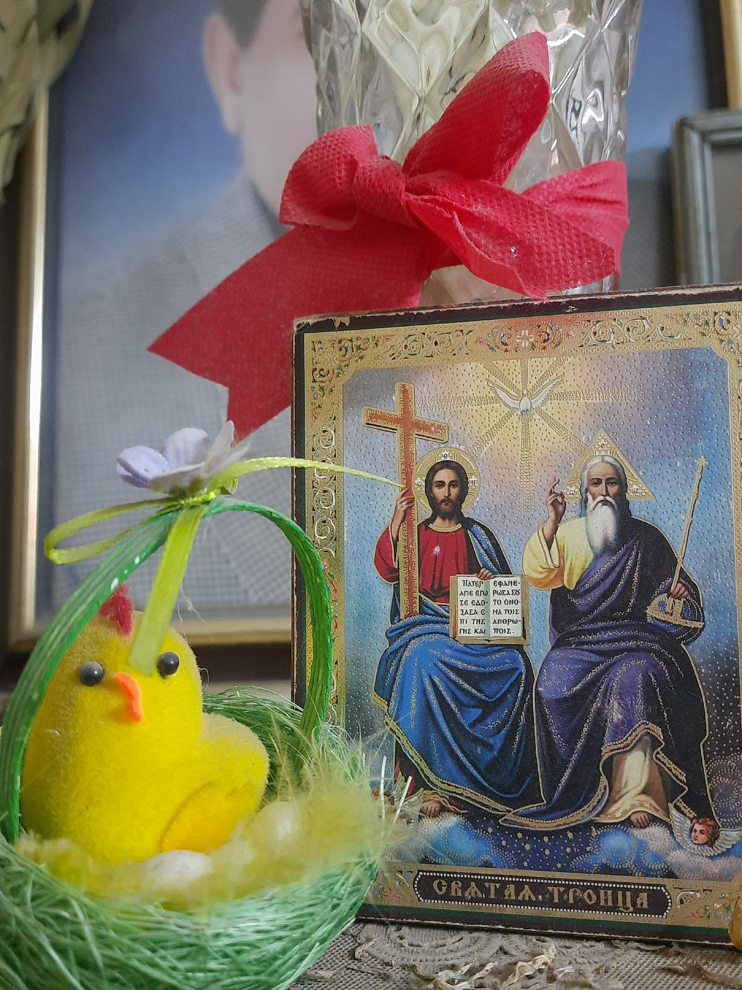 The image shows an orthodox icon depicting the Holy Trinity, consisting of God the Father, Jesus Christ, and the Holy Spirit represented as a dove. The icon's border features ornate detailing. To the…read more
