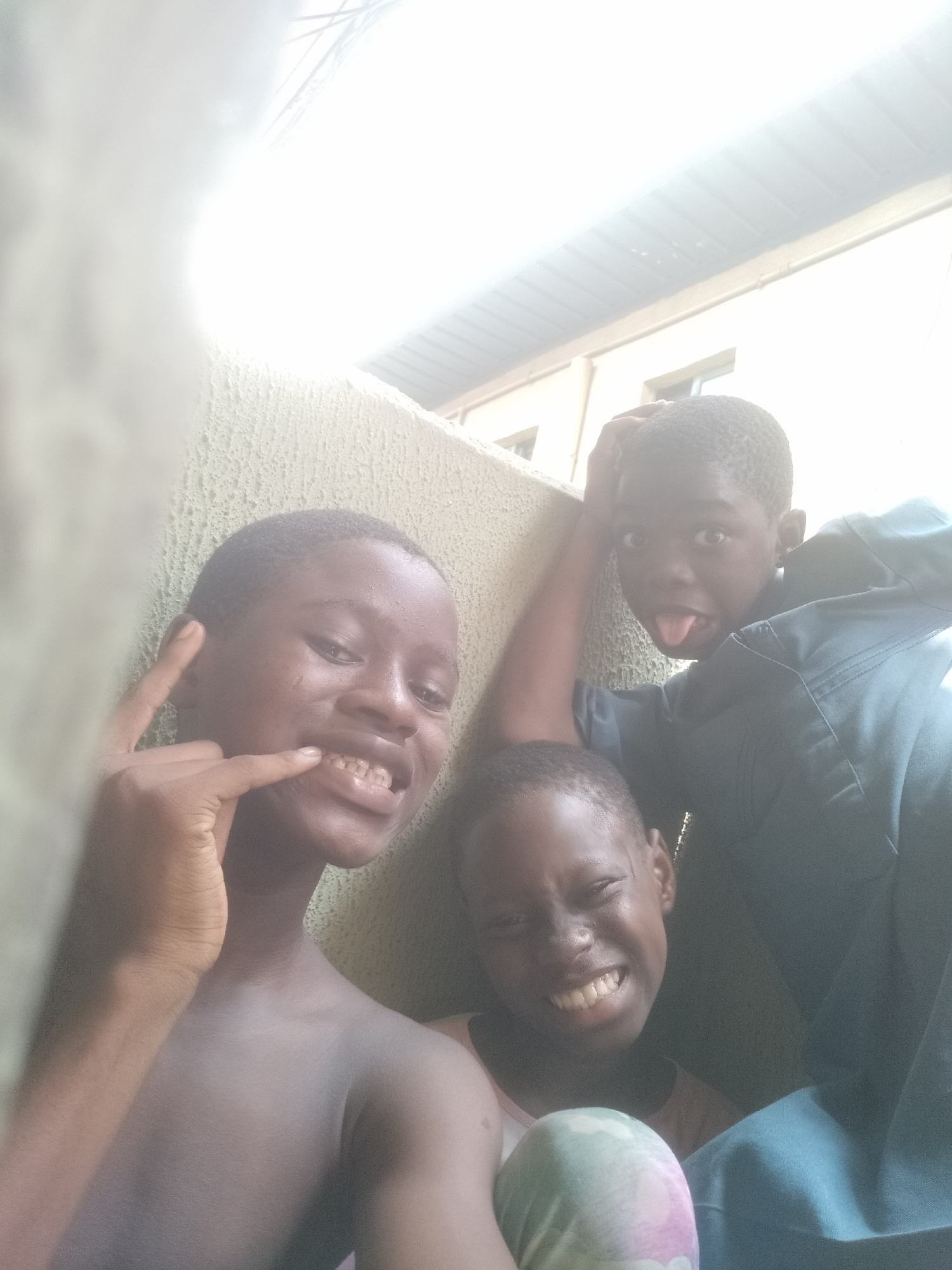 Three children, likely boys, are captured in a playful group photograph set against a textured, light-colored wall. The scene is brightly lit by natural sunlight, causing some overexposure in the uppe…read more