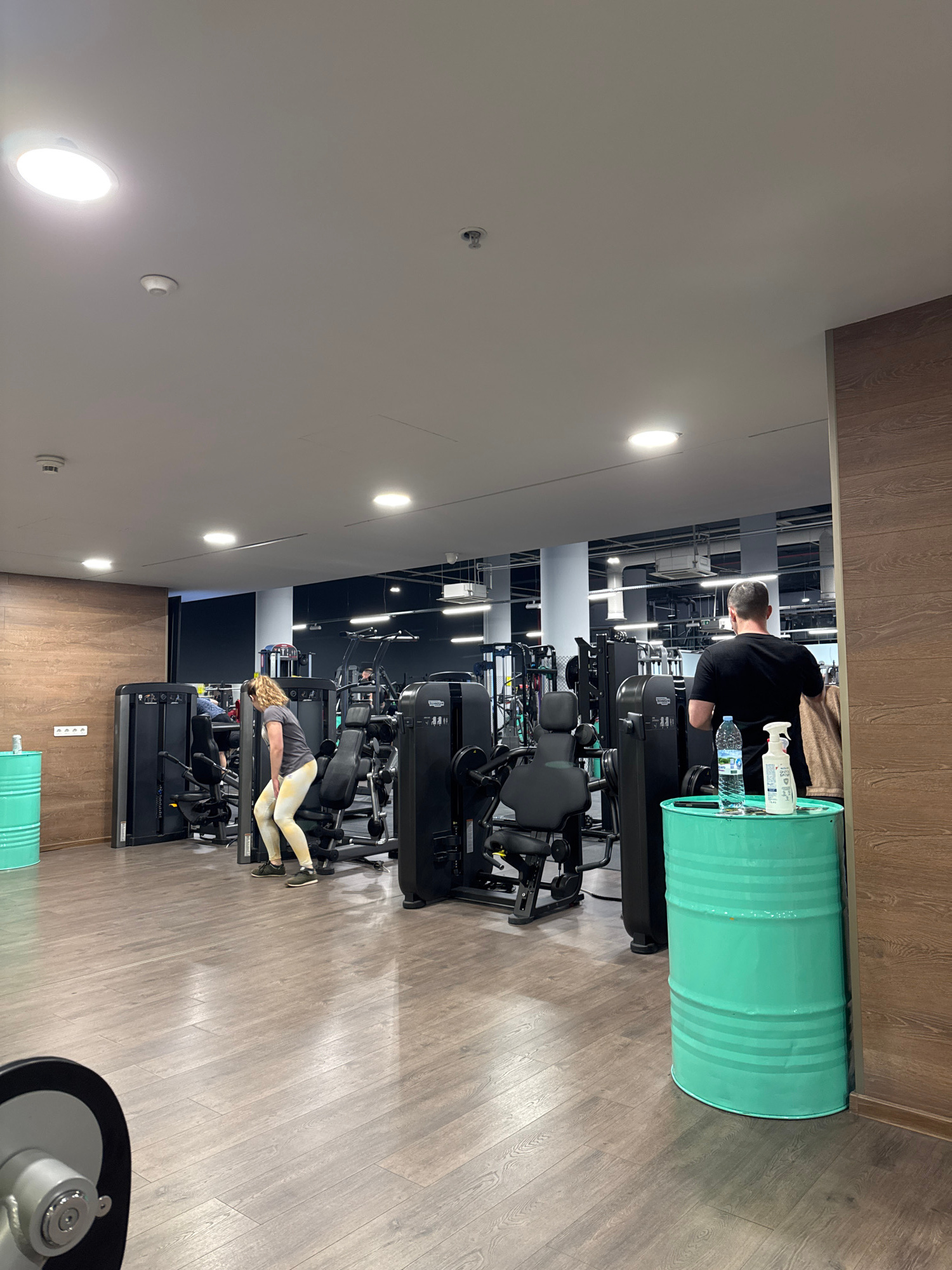 The image depicts the interior of a gym, likely in Varna, Bulgaria, as requested. The space is equipped with various weight machines, including leg curl and upper body machines, mostly black. People a…read more