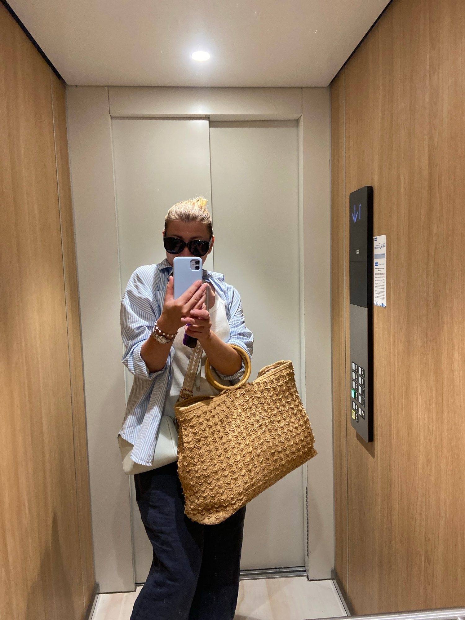 The photograph appears to be taken in an elevator, with a woman visible in the reflection of a mirror positioned on the back wall. She is holding a smartphone and seemingly taking a picture of herself…read more