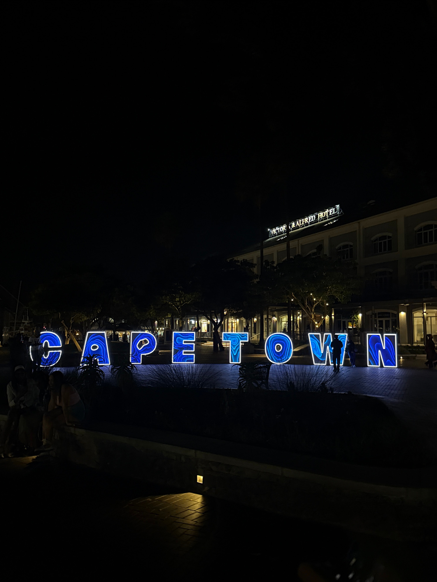 At night, the illuminated vertical sign "CAPE TOWN" is prominently displayed, with each letter rendered in a blue glowing design. The sign stands on a paved area near a building, and people are presen…read more