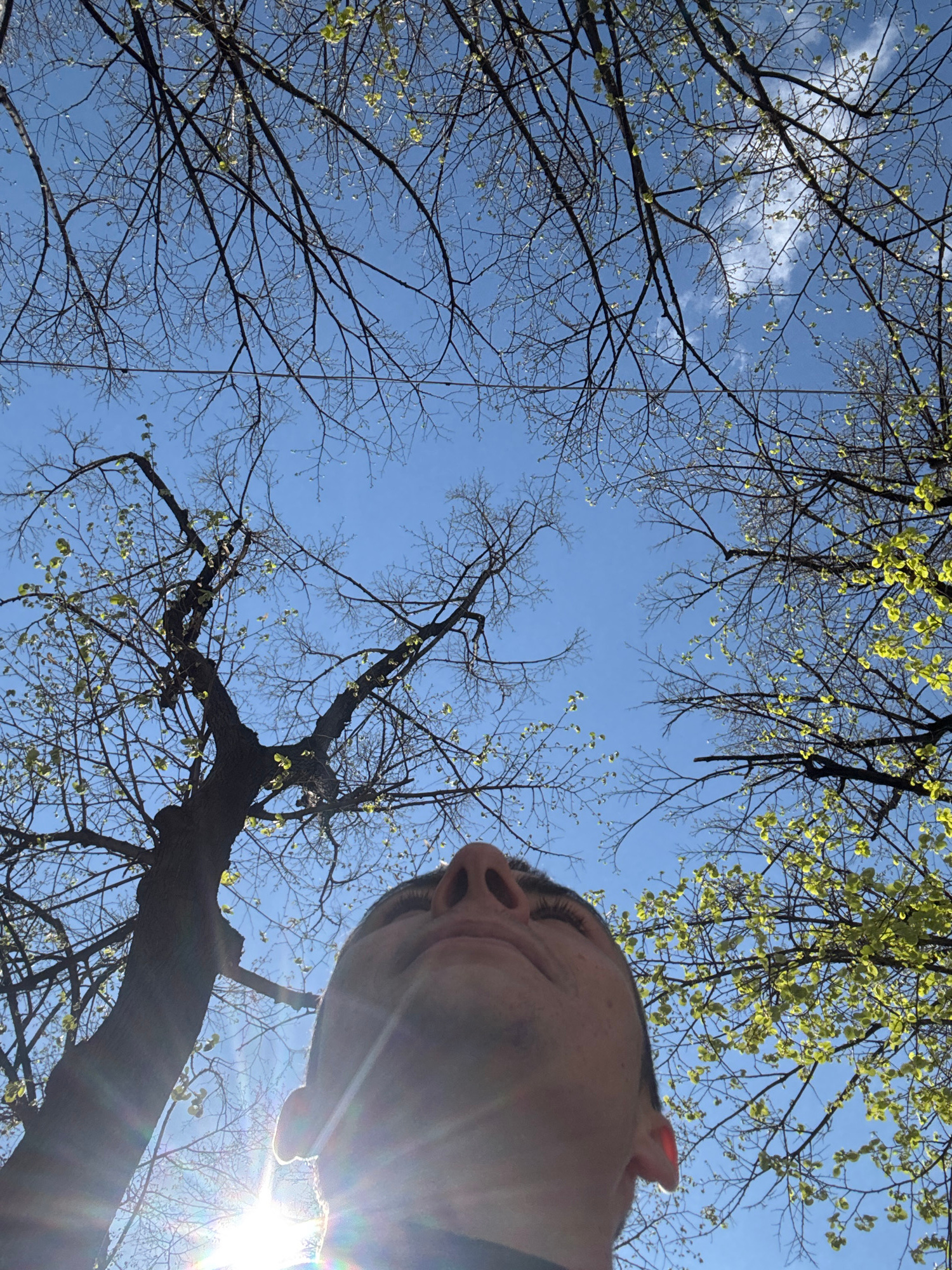 The image is taken from a low-angle perspective, looking up through tree branches towards a blue sky with scattered clouds. The trees are mostly bare, with some sprouting new green leaves. On the righ…read more