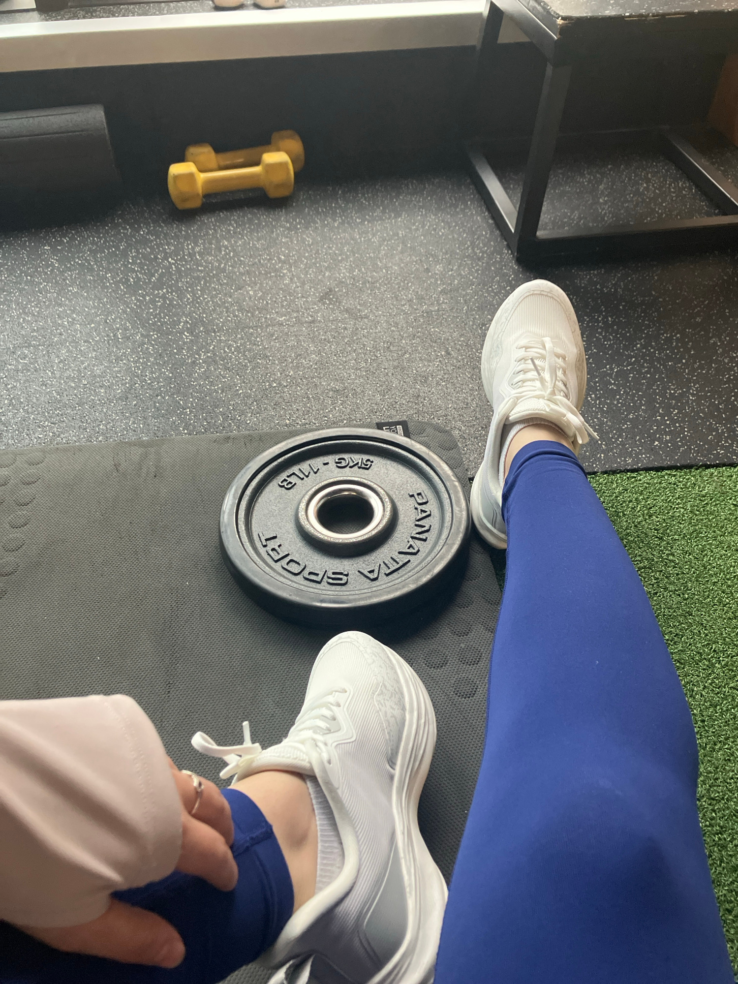 A person is standing on a grey workout mat in a gym setting. The person is wearing blue leggings and white athletic shoes. A 5kg Panatta Sport weight plate is on the mat between their feet. A pair of…read more