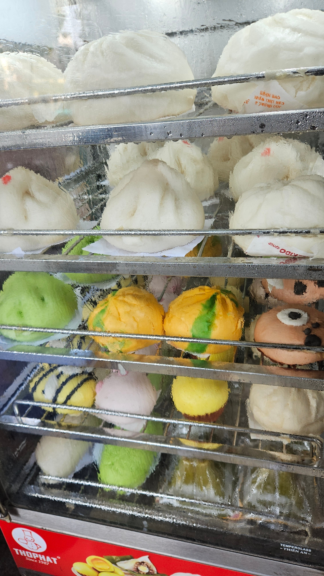 This close-up shot shows a display case filled with various types of steamed buns, likely in Nam Nha Trang, Vietnam. The buns are separated by metal bars in the case. On the left are traditional white…read more