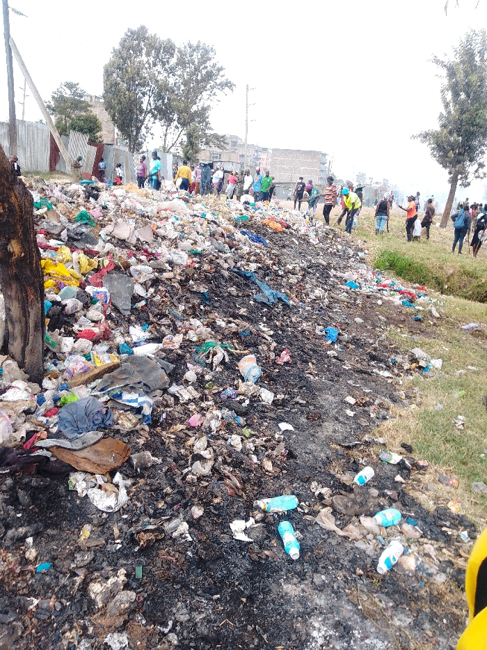 A large pile of garbage dominates the scene, featuring plastic bags, bottles, and other debris. Some parts appear to be burned, with black, charred areas visible. A group of people is visible in the b…read more