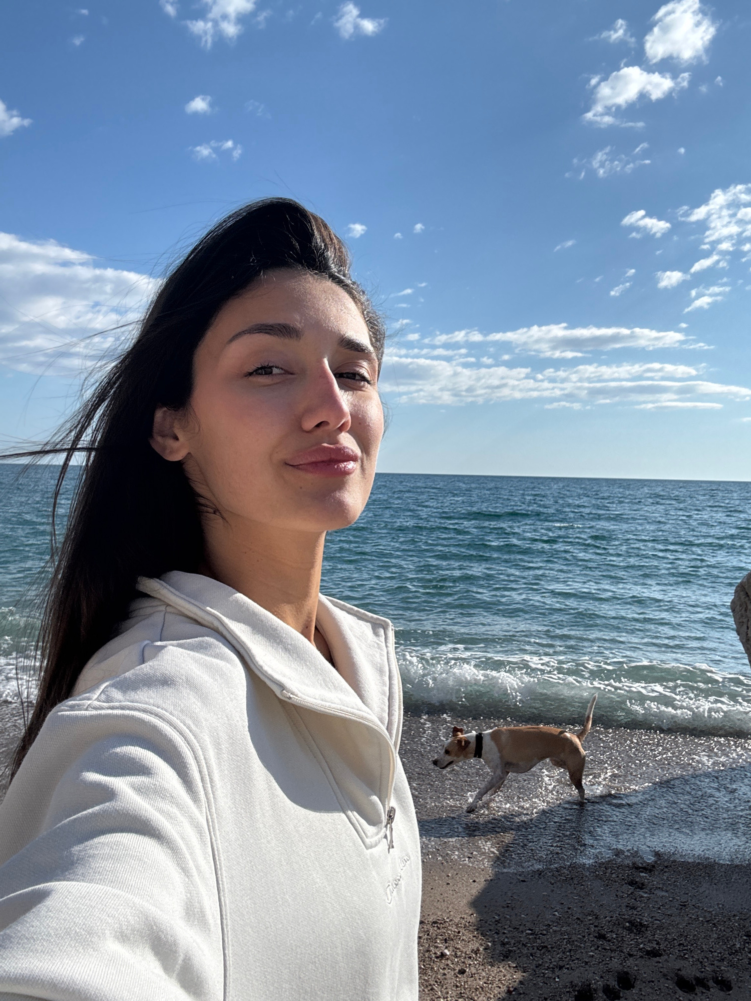 The image depicts a female individual and a dog on a beach in Sutomore, Montenegro, under a bright blue sky with scattered white clouds. A female subject occupies the left side of the foreground, faci…read more