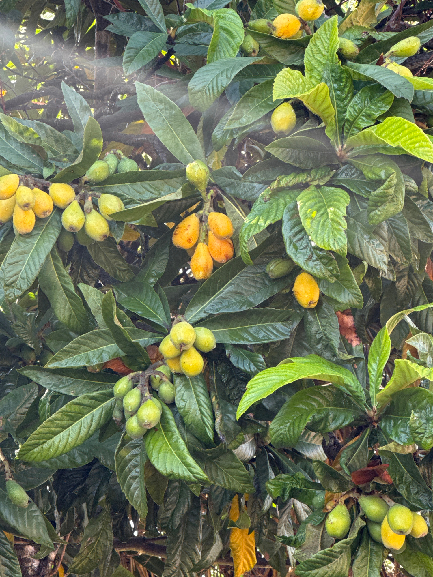 The image depicts a tree laden with loquat fruits (Eriobotrya japonica) in varying stages of ripeness, from green to yellow-orange. The fruits are clustered in small bunches among large, glossy, dark…read more