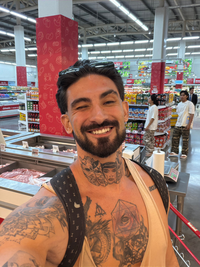 A male individual with dark hair, a beard, and numerous tattoos on his neck, chest, and left arm, is depicted from the chest up, smiling broadly and winking with his left eye. He wears a light-colored…read more