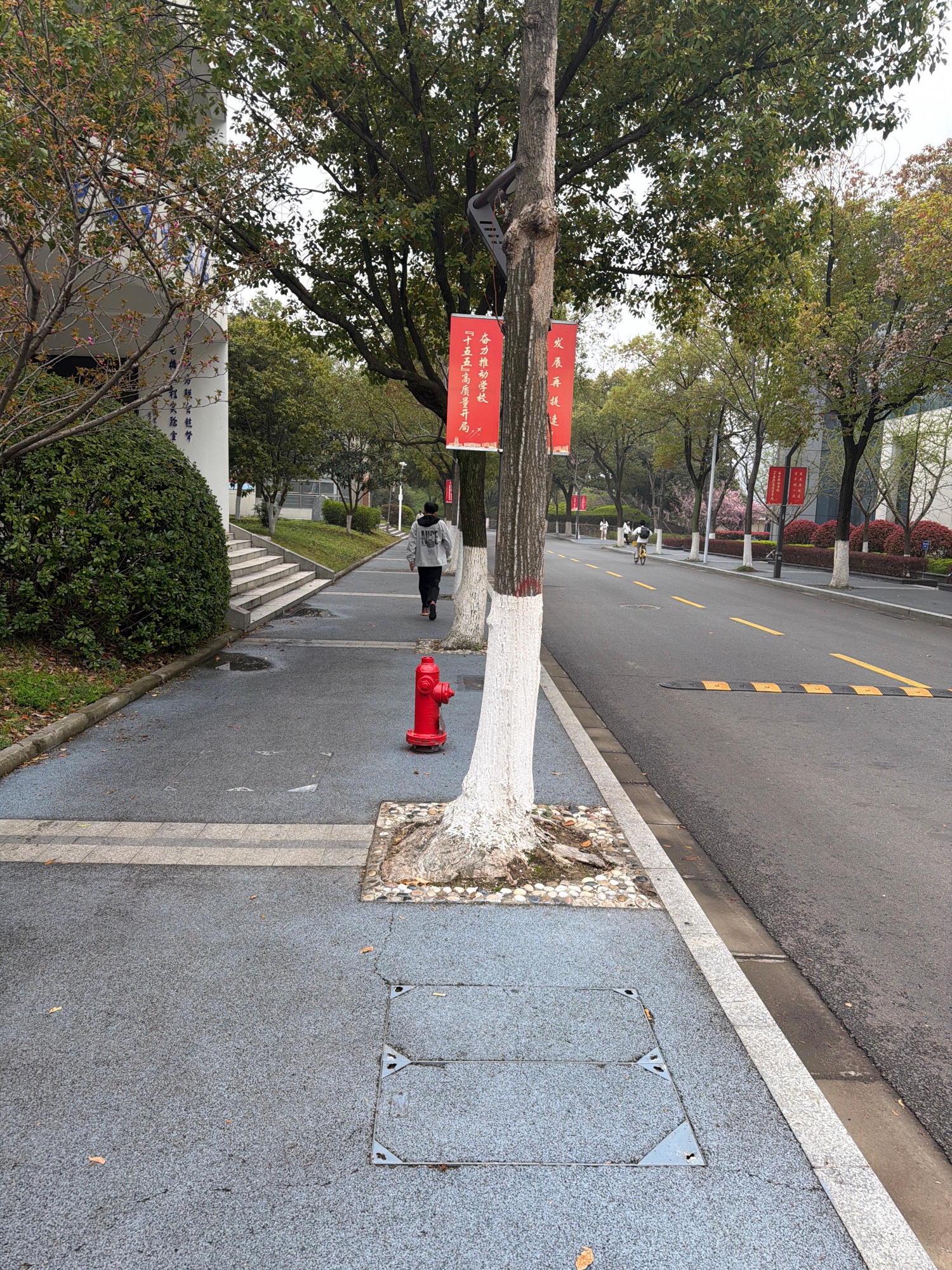 The image depicts a street scene in Jiangning District, China. A person walks on the sidewalk, passing by a red fire hydrant next to a tree with a whitewashed base. Red banners with Chinese characters…read more