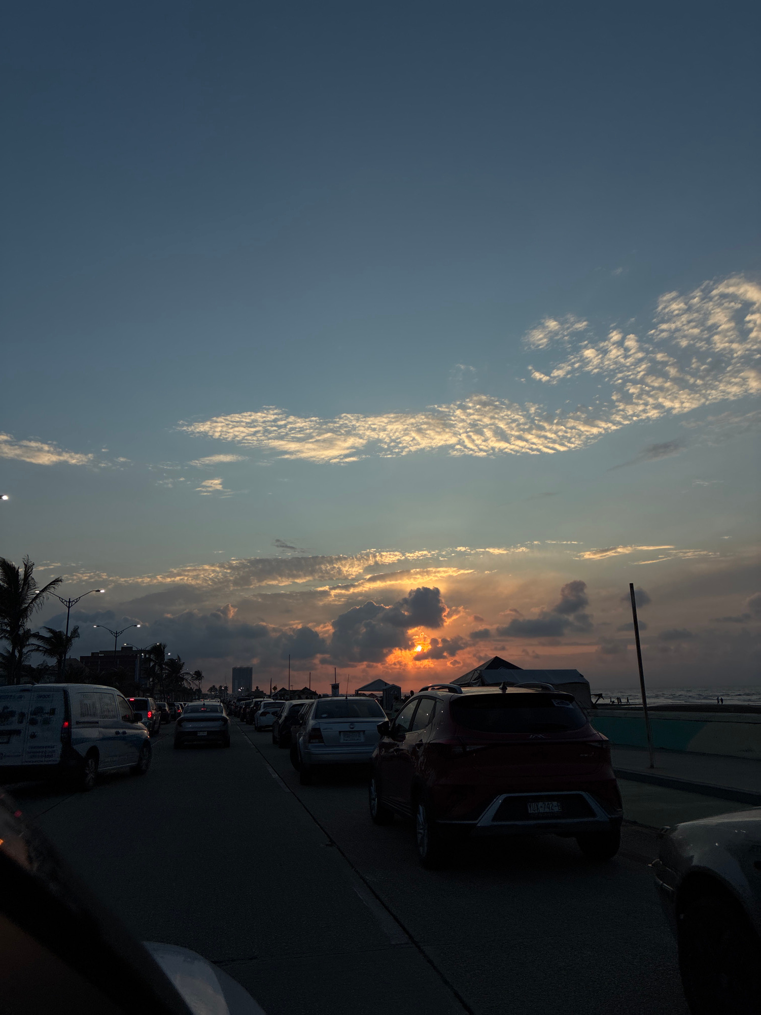 The image shows a street scene in Coatzacoalcos, Mexico at sunset. A line of cars is moving along a road next to the beach, with palm trees and street lamps visible. The sky is filled with clouds, the…read more